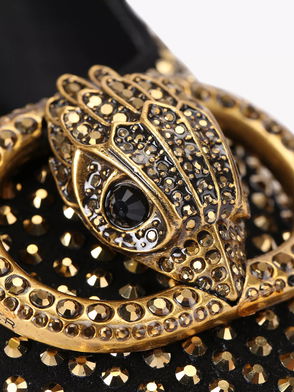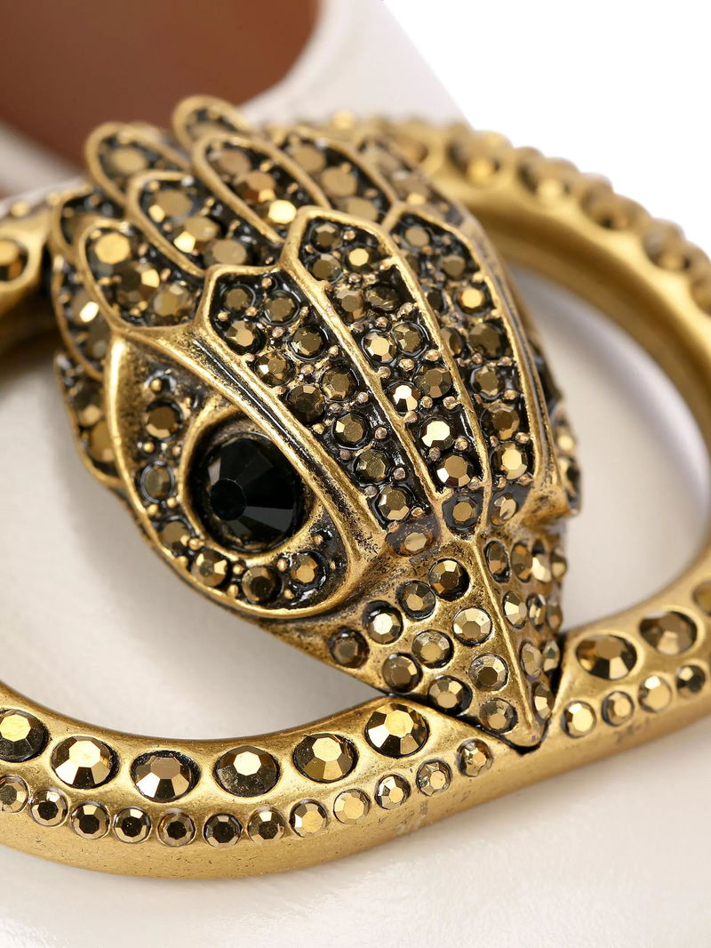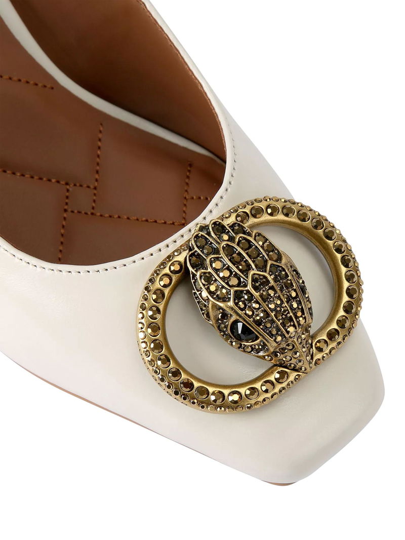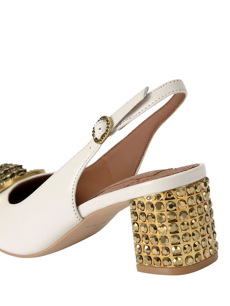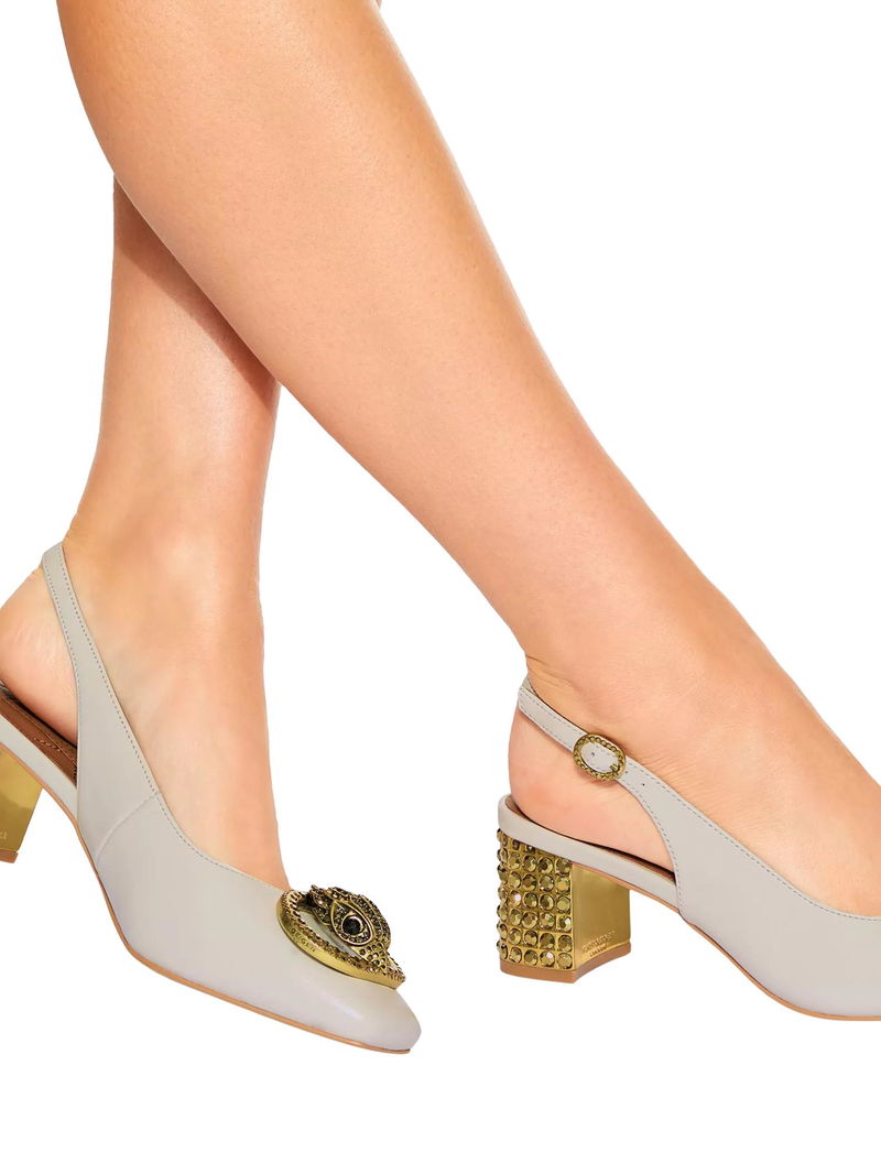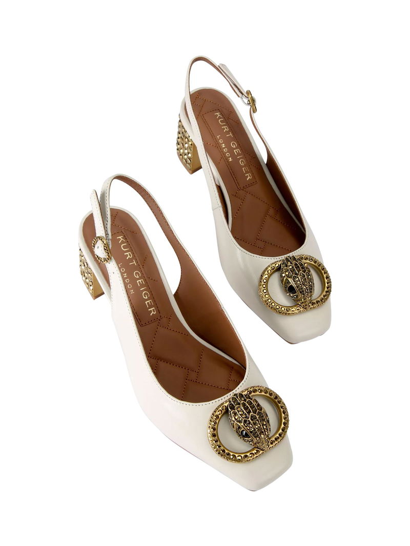 Sleek patent slingback sandals from Kurt Geiger London, featuring a pointed closed toe and secure buckle fastening. The mid-height block heel offers support for your evening plans, while playful gold-toned embellishments set you apart.