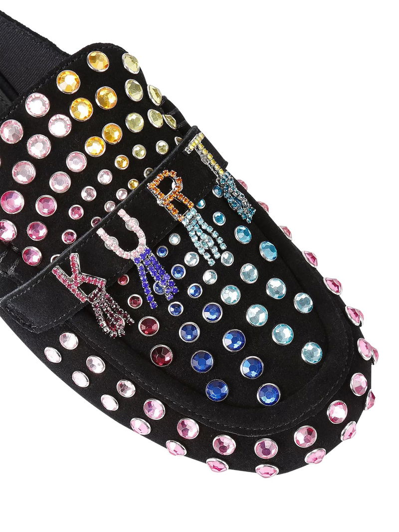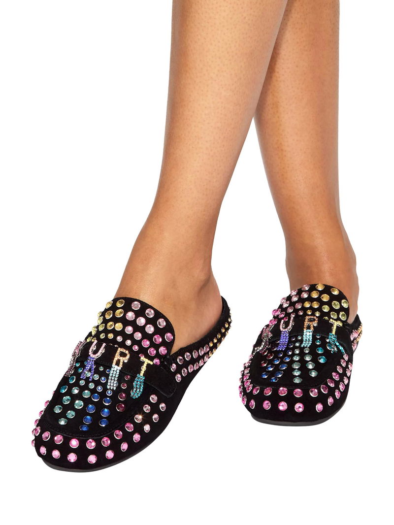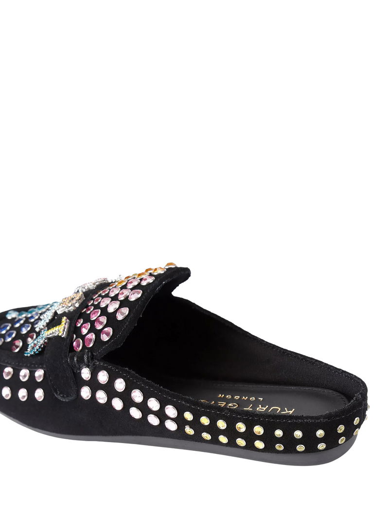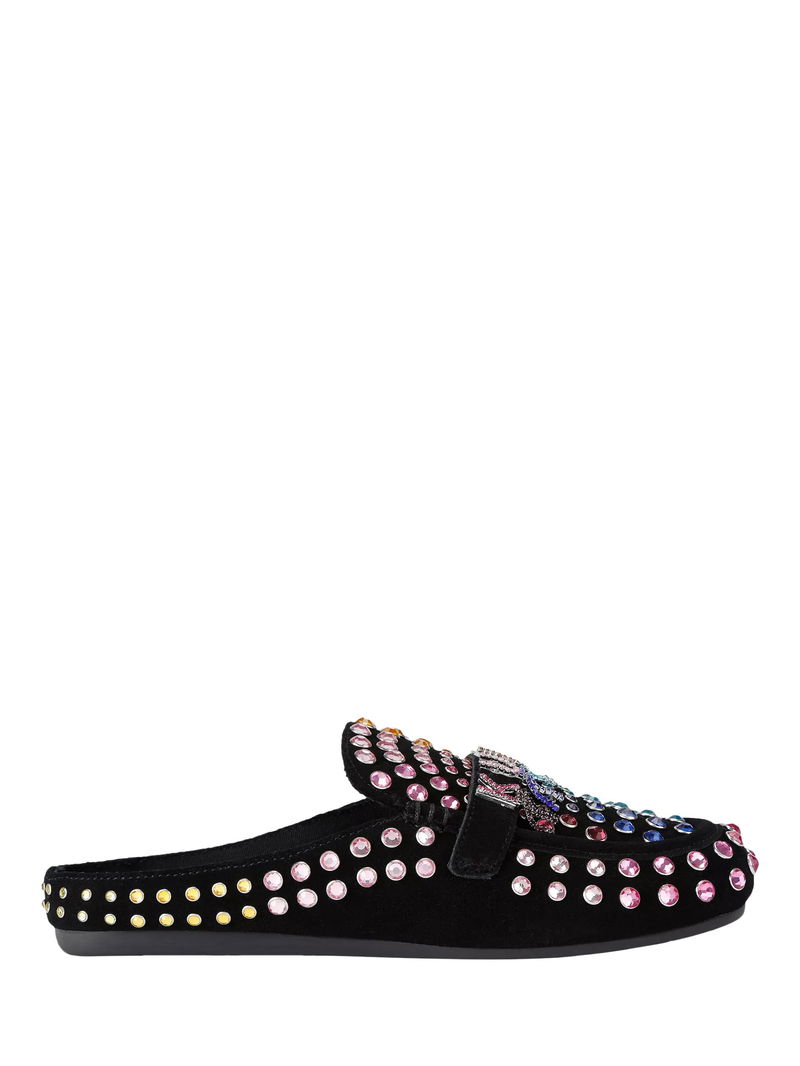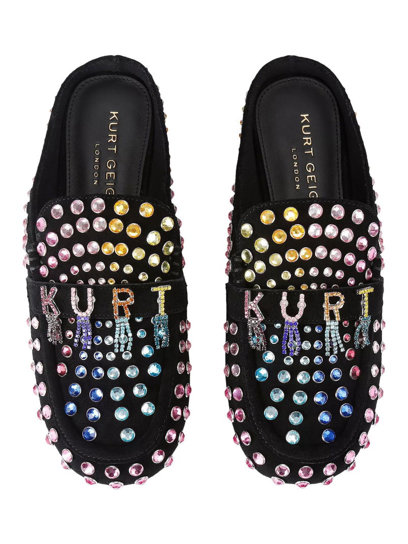 Kurt Geiger London slipper mules, crafted in soft suede with rainbow studded crystal embellishment. Slipping on with ease, they're complete with fringed branding, bringing comfort and unexpected flair to your everyday adventures.