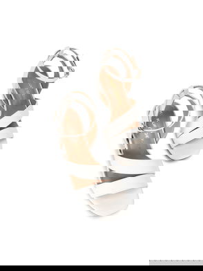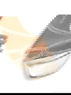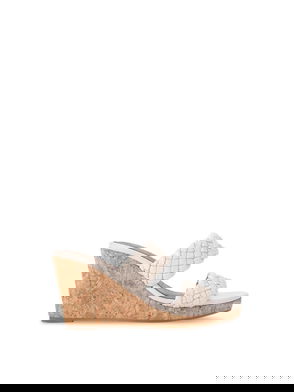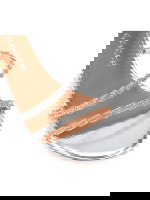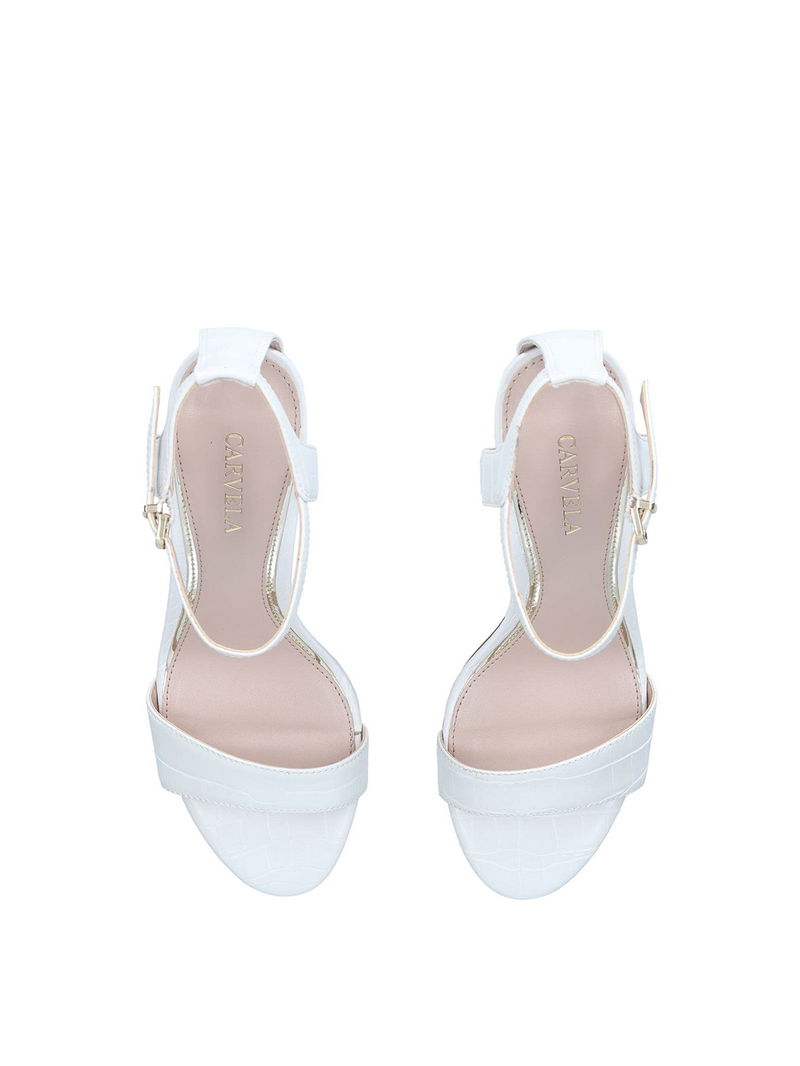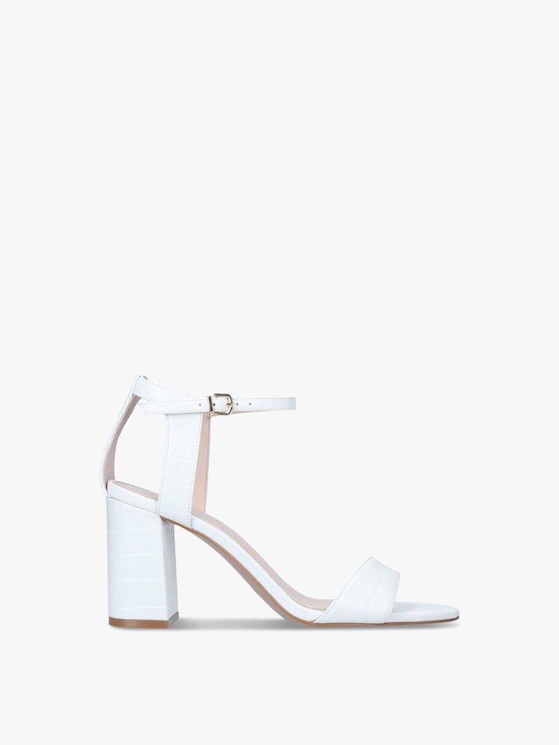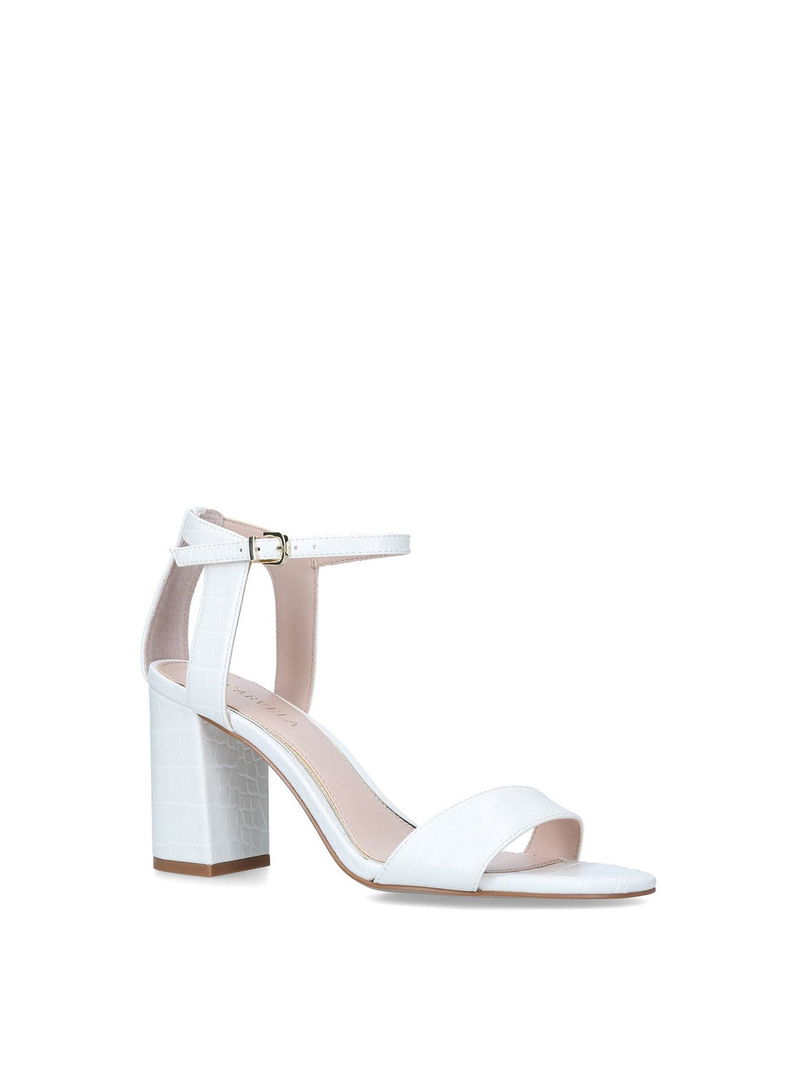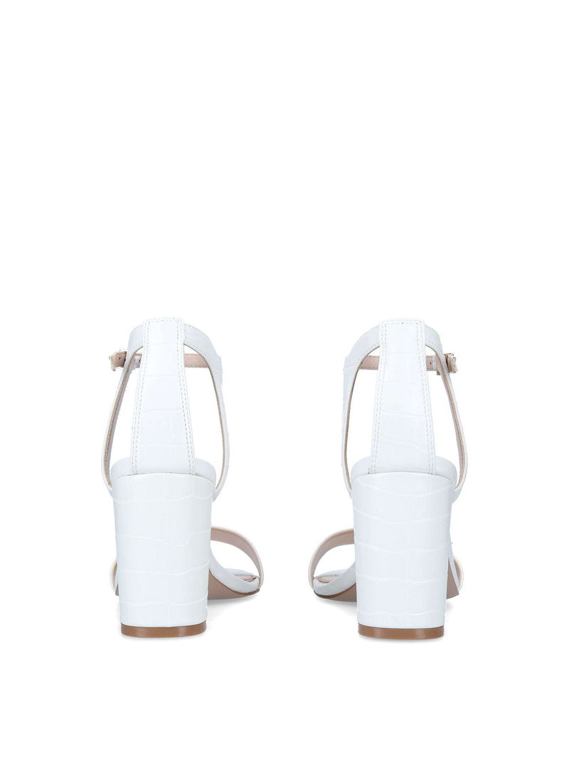 The Carvela Kiki is a block heeled sandal. The upper is in a bone snake embossed design with open toe. The ankle is fastened with gold tone buckle and features an Icon C stud.