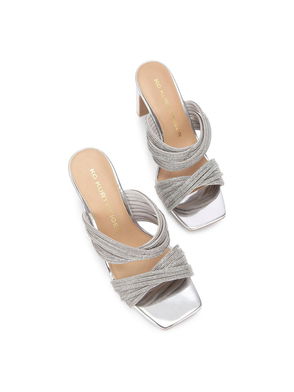 The Kurt Geiger Mayfair High Mule heel features a beige houndstooth upper that is embellished with large gold crystals.