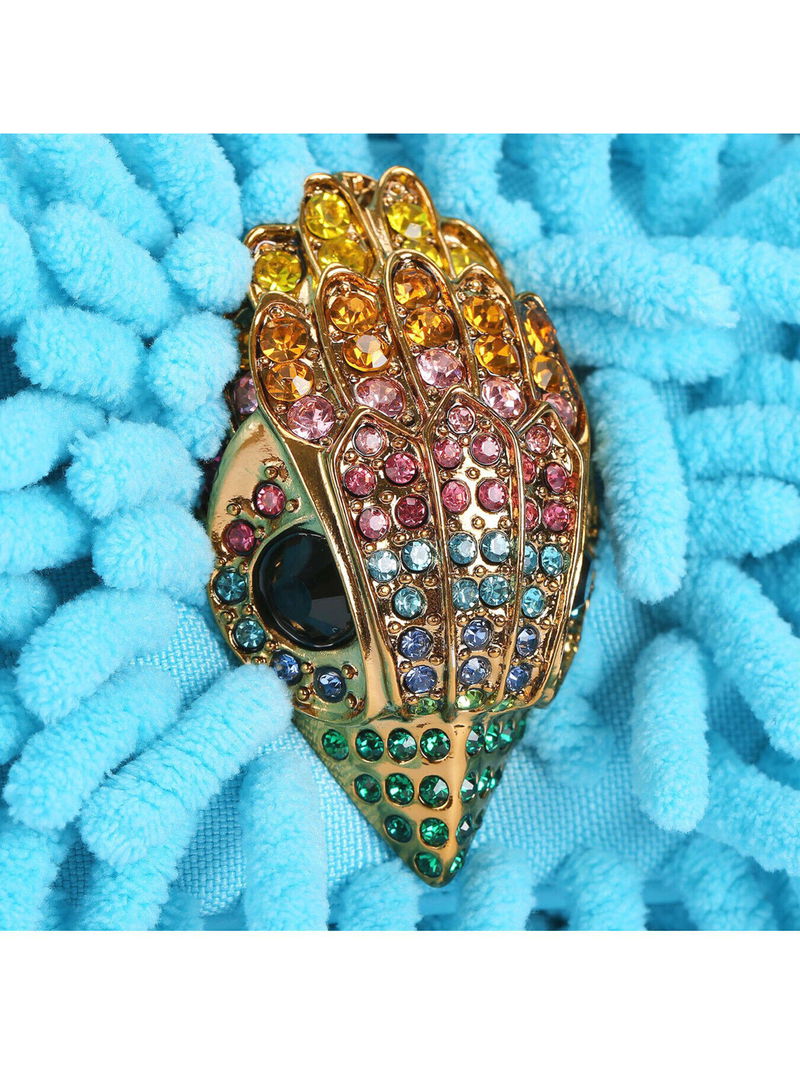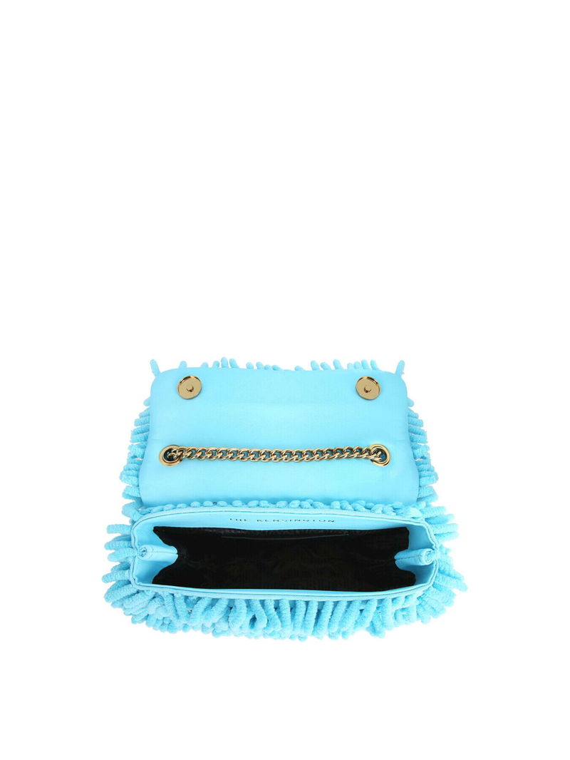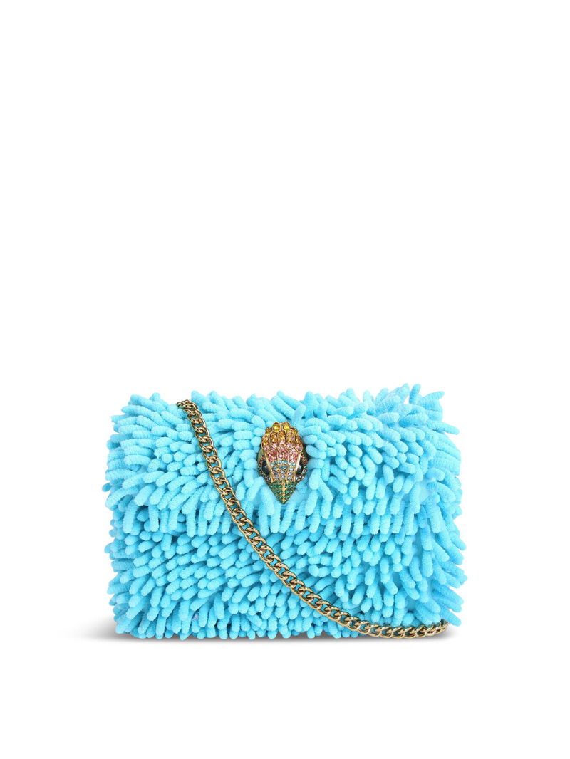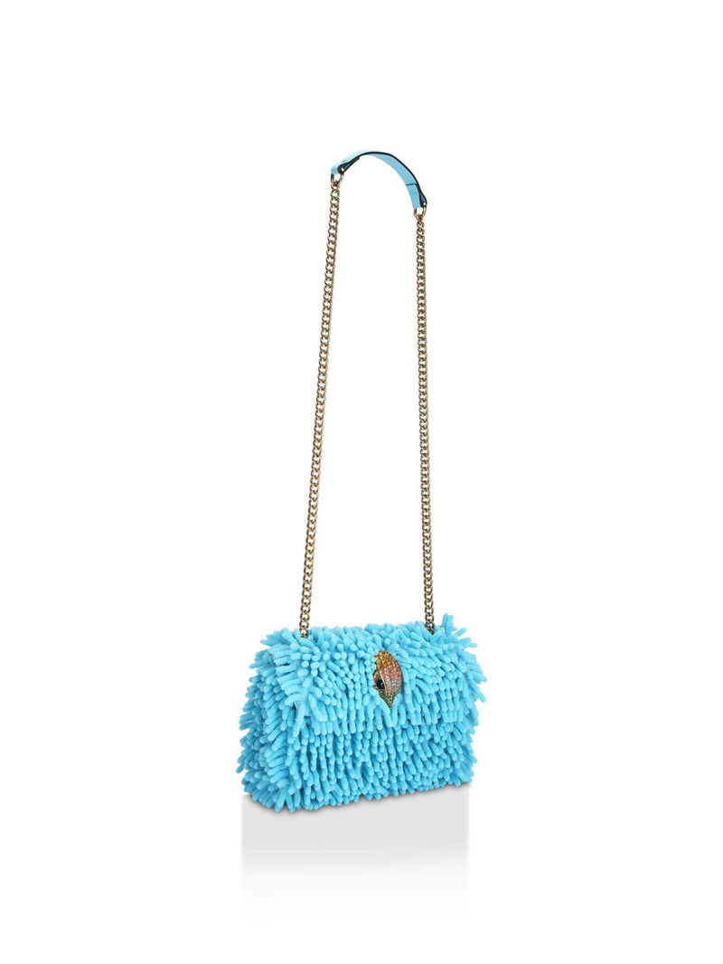 The Kurt Geiger London Medium Kensington features a blue exterior with all over tassel detail. The large eagle head features rainbow crystals and black crystal eyes on the front flap.