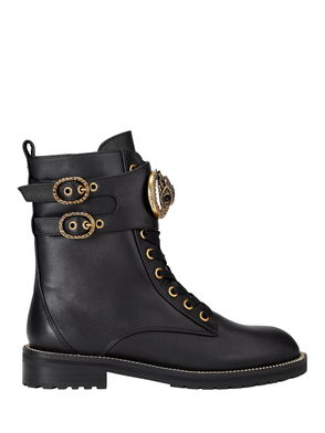 Blending a black upper with a touch of Kurt Geiger London luxury, Mini Stoop is sure to be a hit with your mini fashionista. Combining a biker boot silhouette with a round toe, this ankle boot is finished with a gold double buckle detail strap and silver-tone stud embellishments.