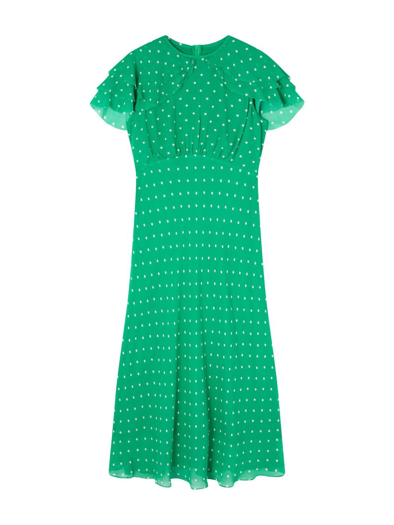 The Ellen Green and Birch Polka Dot Print Dress showcases a charming polka dot pattern complemented by a delicate ruffle collar. This design detail adds a touch of elegance and femininity, making the dress suitable for both casual and semi-formal occasions. Its classic print and refined collar create a timeless look.