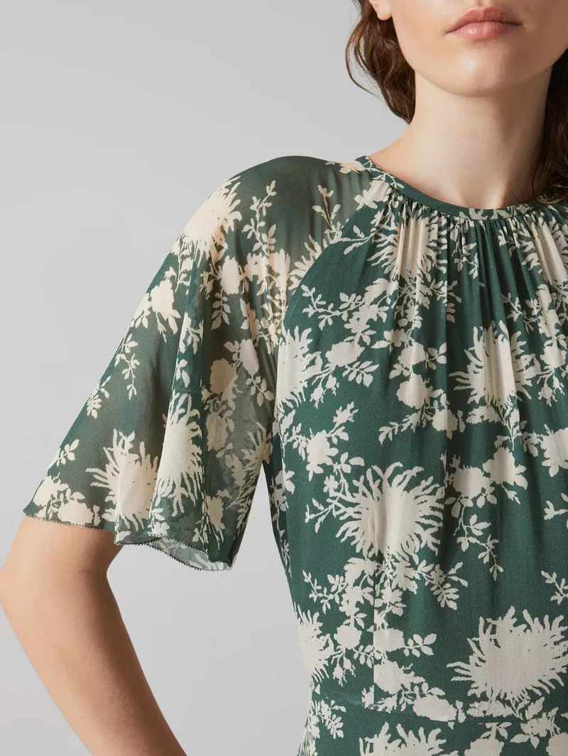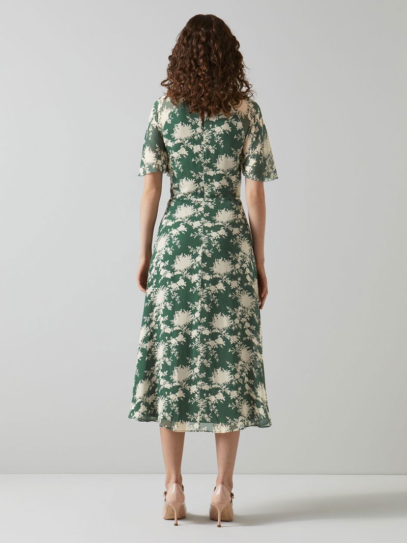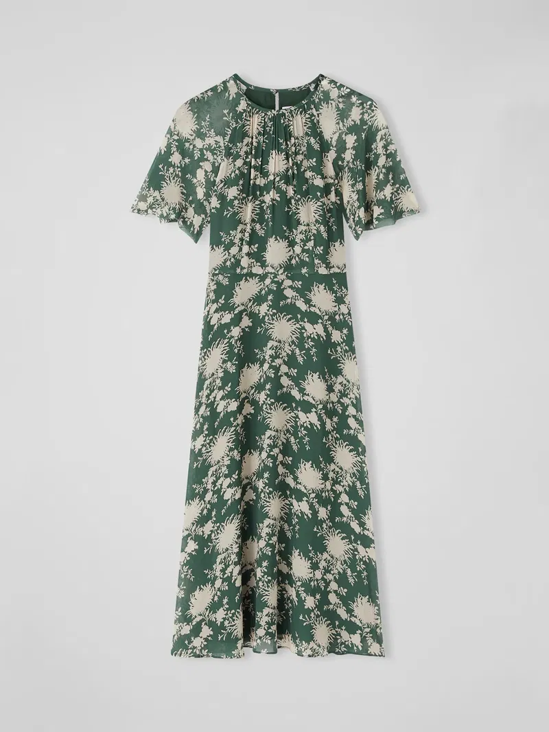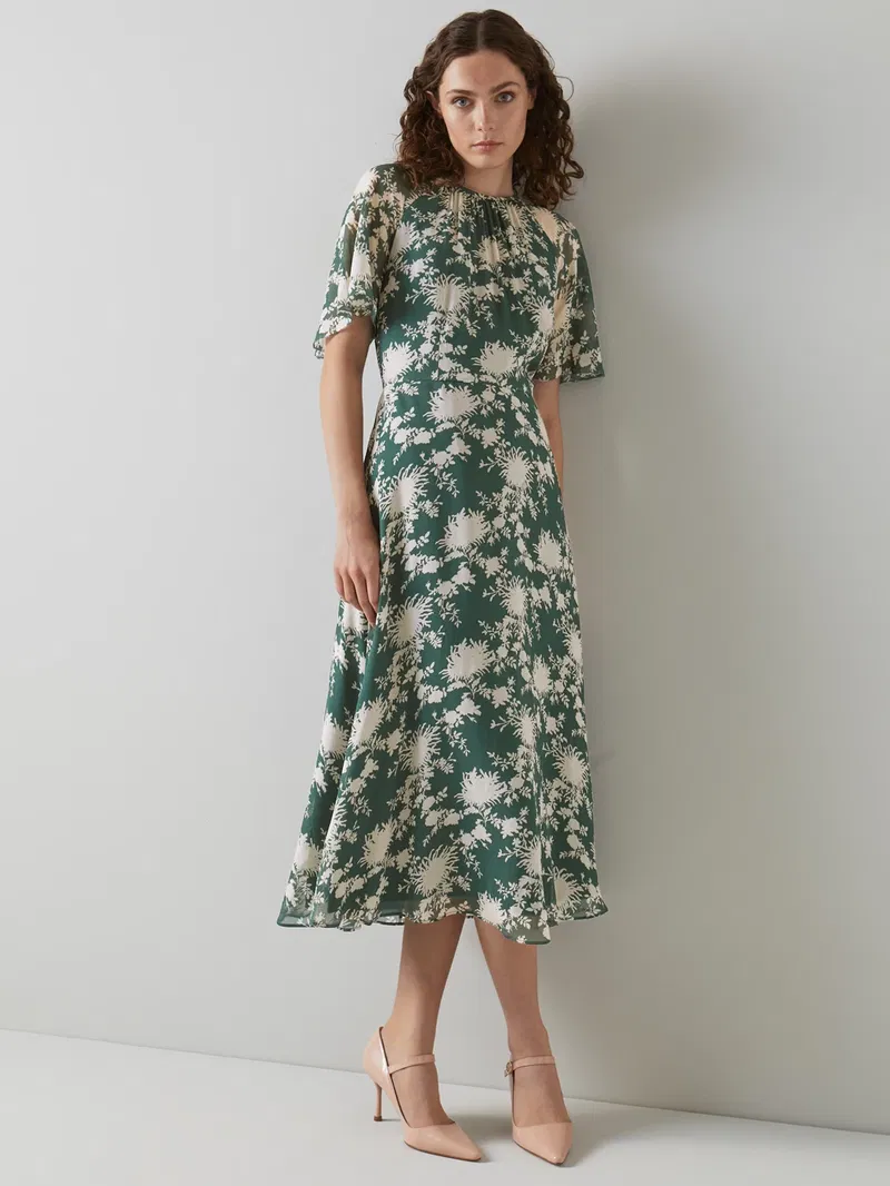 Easy to wear in an A-line silhouette, this midi dress by L.K.Bennett is doused in pretty florals. With a simple crew neck and elbow length sleeves, this piece wears well with stiletto heels and a sleek clutch for special occasions.