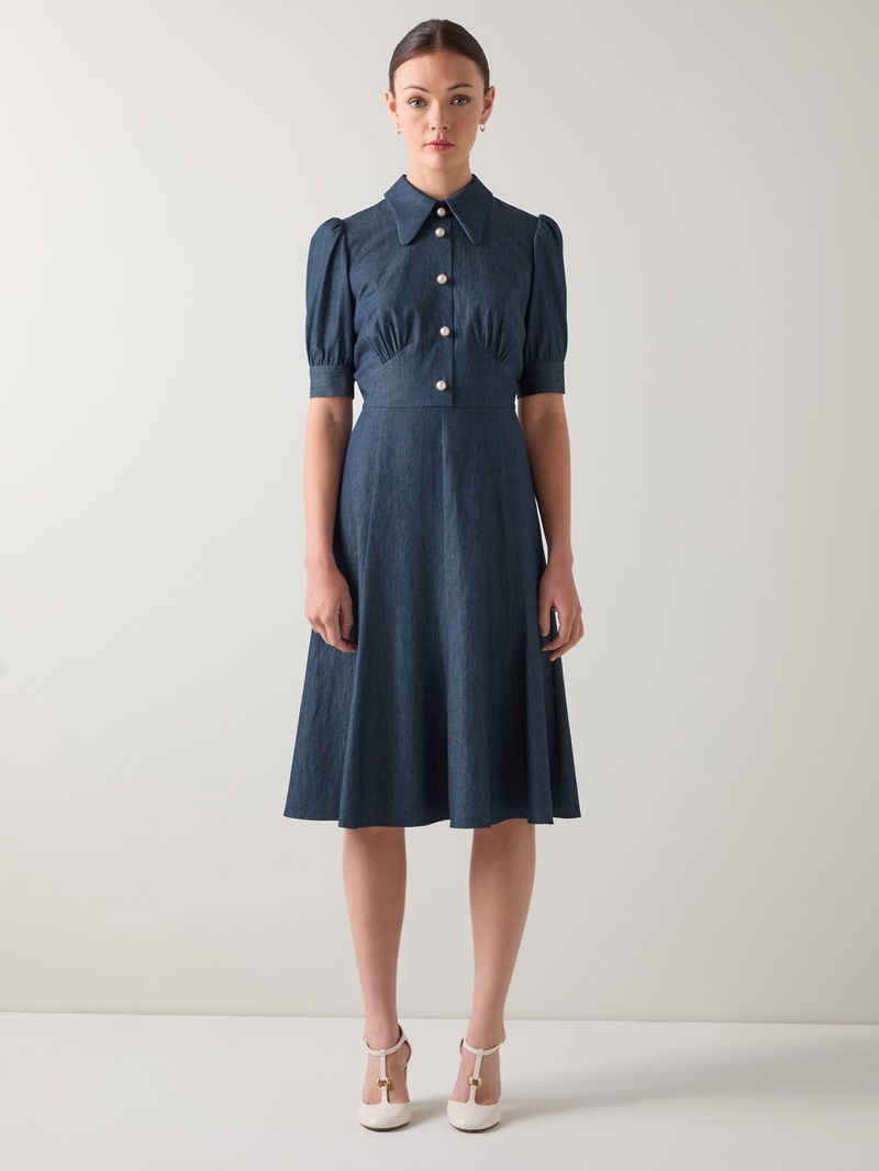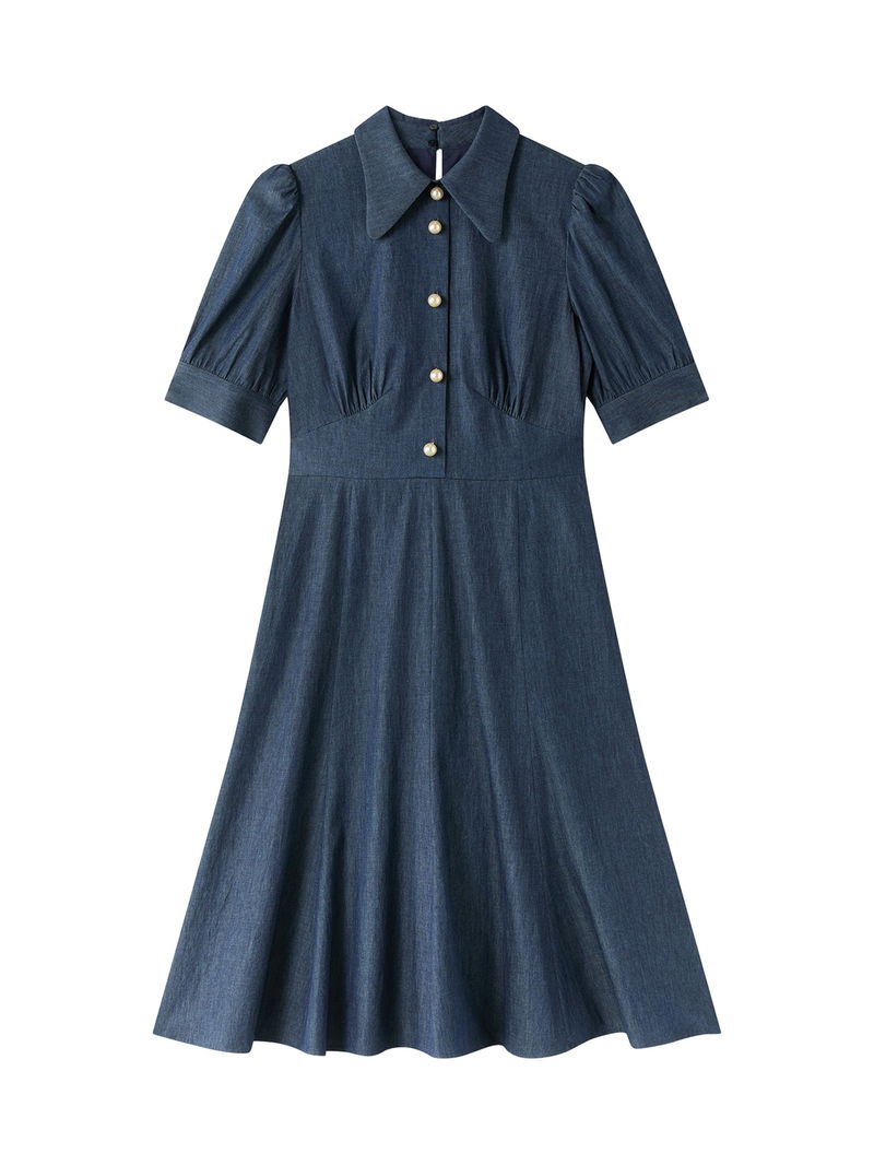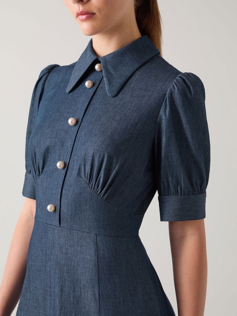 Esme Plain Cotton Chambray Pearl Button Dress Blue