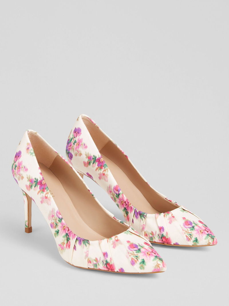 The perfect pair of heels for a summer season, L.K.Bennett's Florena courts are designed with a matching clutch for all your fanciest moments. Crafted in Spain from cream cotton with a pink and purple bouquet print, they have a pointed toe, pretty pleat detail and an elegant 85mm stiletto heel. Wear them for weddings, parties or a day at the races to bring a little colour and print to the occasion.