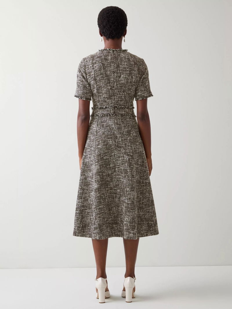 Fitted, flared, and fabulous. This cotton mix midi dress from L.K.Bennett has a simple round neckline, short sleeves and is textured for a tactile finish.