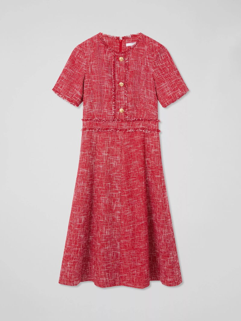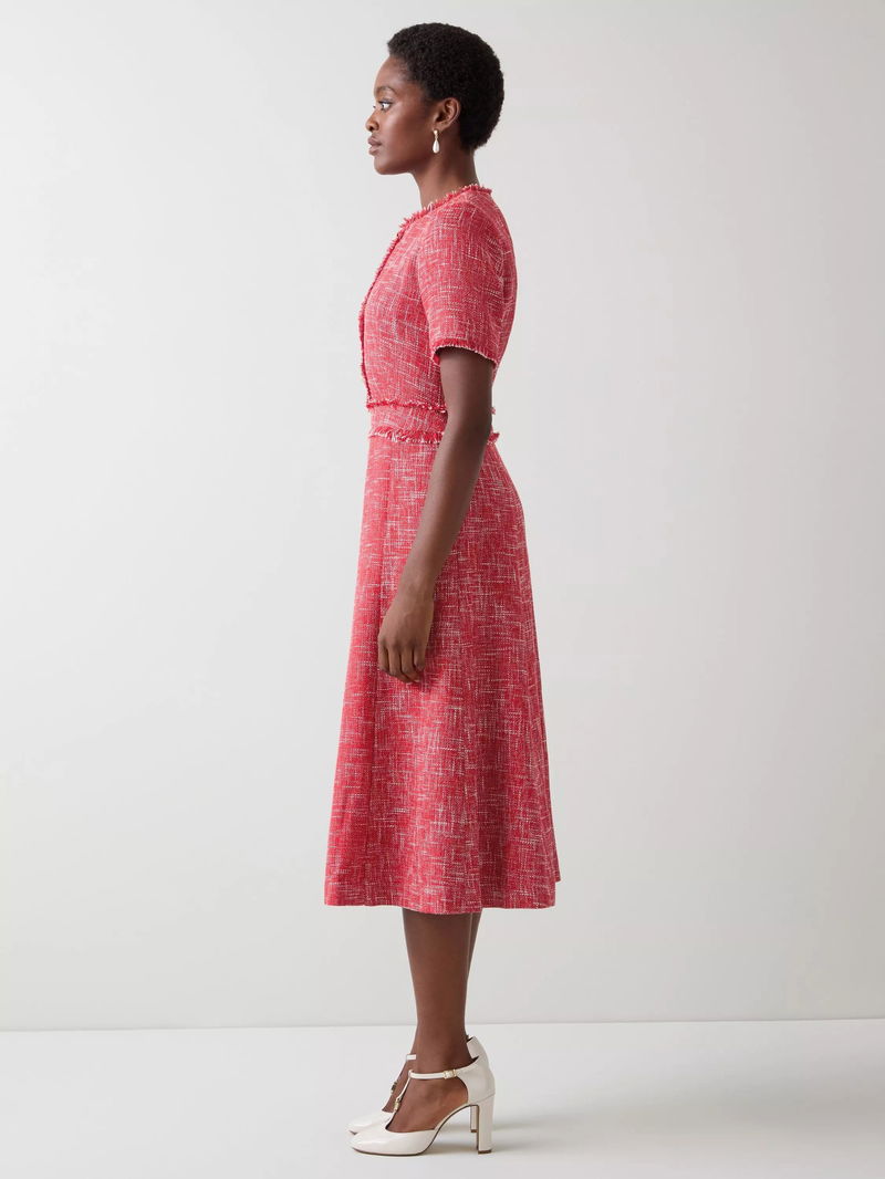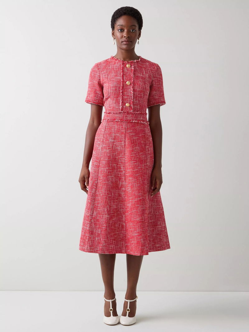 Fitted, flared, and fabulous. This cotton mix midi dress from L.K.Bennett has a simple round neckline, short sleeves and is textured for a tactile finish.
