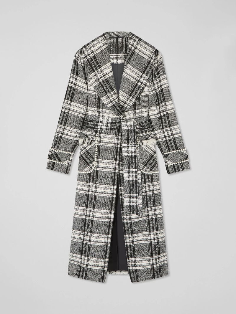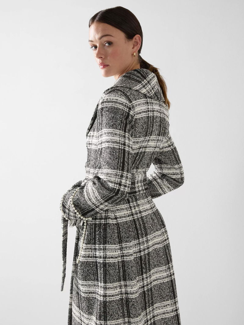 The Myra coat embodies effortless style with its oversized, unstructured silhouette in a check pattern. With a maxi-length design, this wrap coat features pearl trim detailing. Functional side pockets add practicality, while the classic collar and long sleeves create a timeless silhouette.