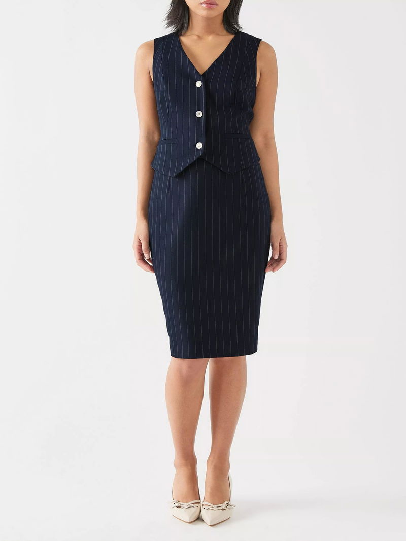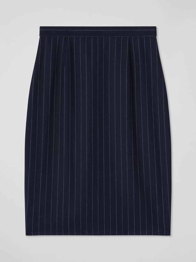The Bella petite skirt offers sophisticated elegance. This wool-blend pencil skirt, adorned with a chic pinstripe, combines classic workwear charm with modern flair.
