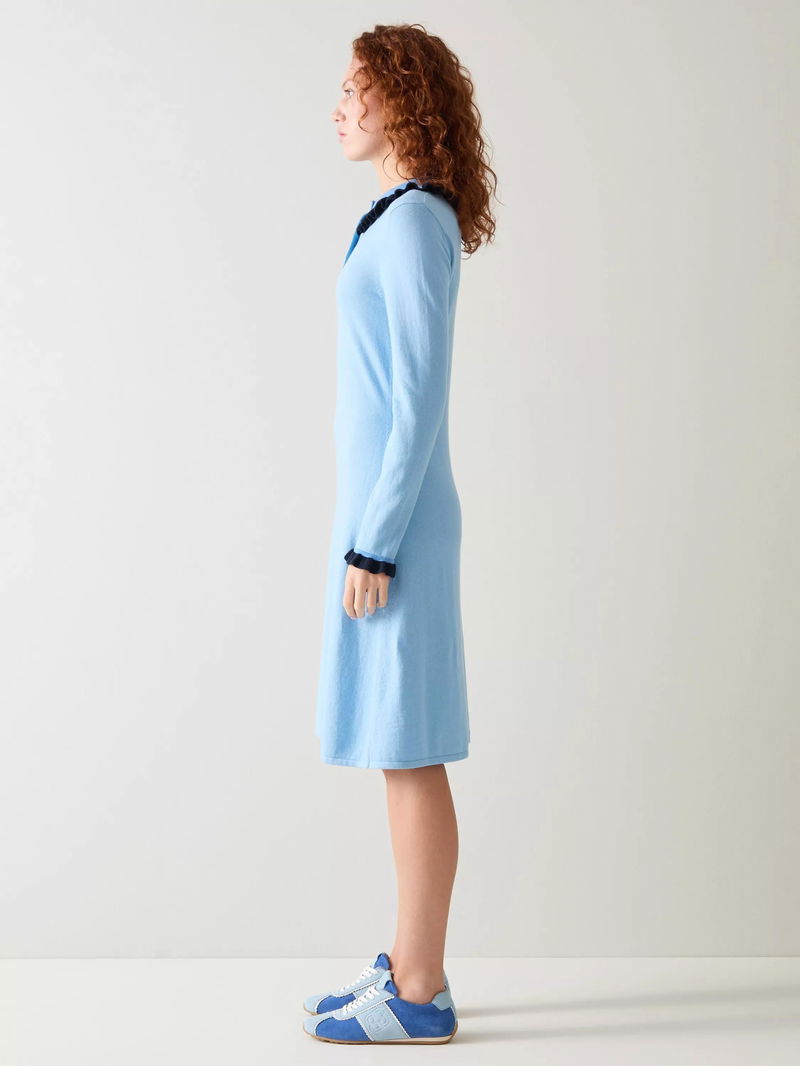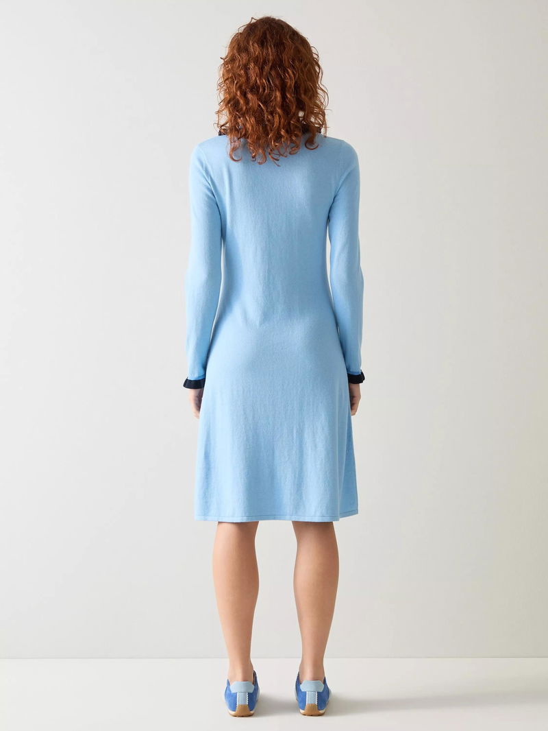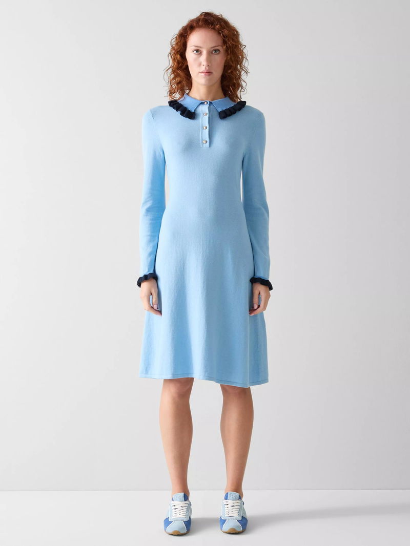 The Tate dress combines classic elegance with contemporary styling. Featuring a frill collar and long sleeves in a colourblock design, this knitted dress creates a flattering fit and flare silhouette. Crafted from a soft cotton mix for exceptional comfort and drape, it falls below knee length for easy styling. Perfect for office or dinners, this dress offers a polished silhouette that transitions effortlessly from day to evening.
