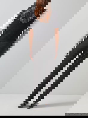 Part of the LKB London collection, these black cigarette trousers offer a sleek, modern silhouette with a subtle twist. Silver tape runs along the side seams, adding a metallic edge to everyday tailoring. Cut to sit comfortably at the waist and finish at the ankle, style them with blouses, knits, and jackets for a contemporary, polished look.