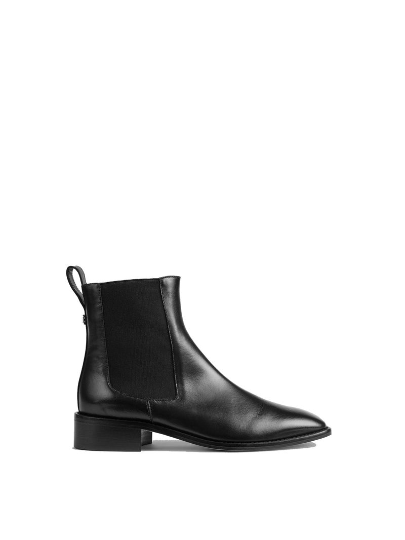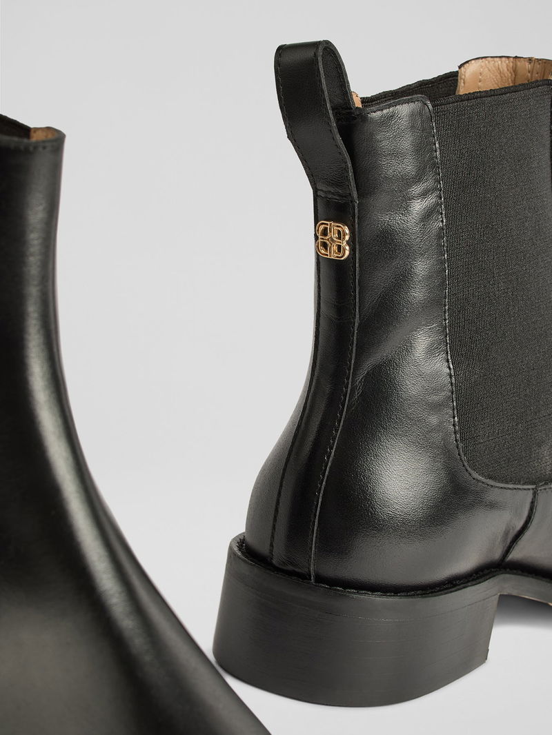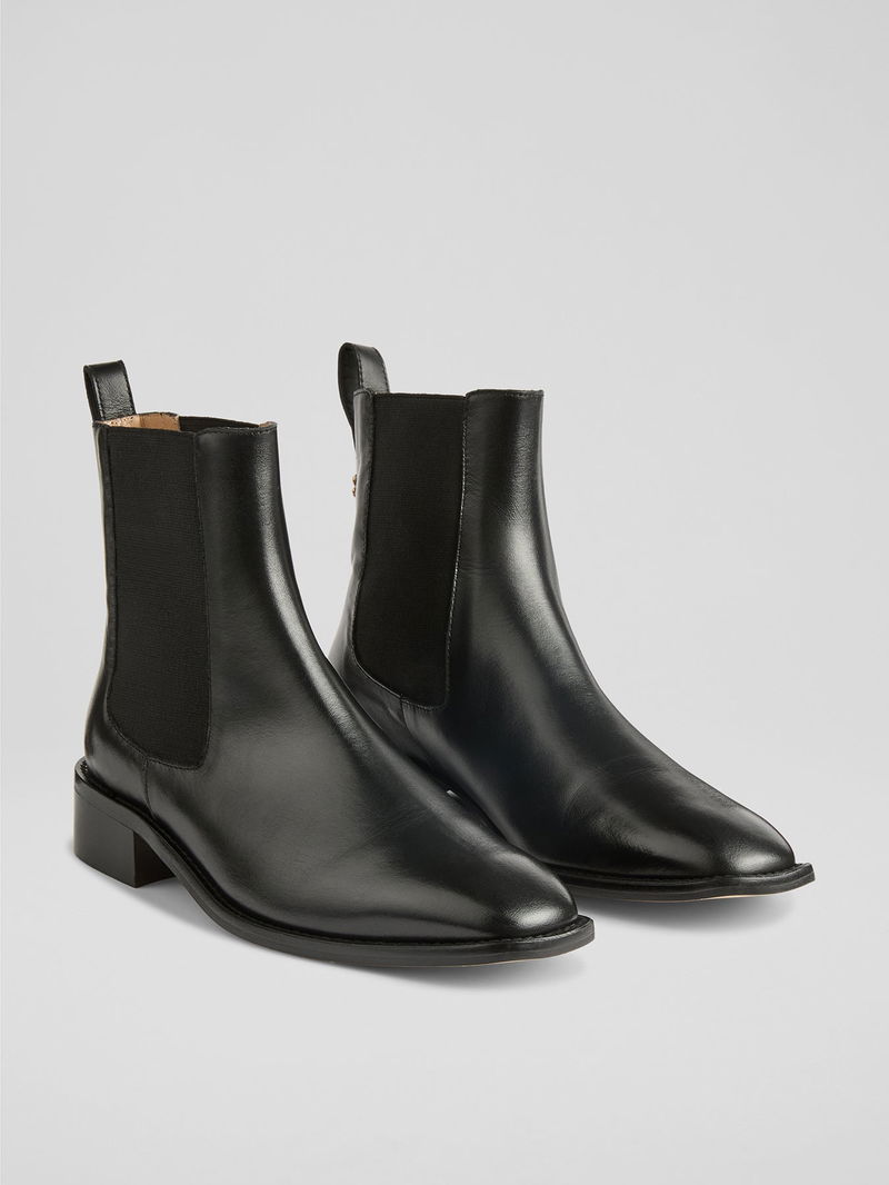 The Logo Leather Ankle Boots by LK Bennett are crafted from smooth black leather with a rounded toe and small stacked heel. Finished with subtle logo hardware, they offer quiet luxury and lasting versatility.