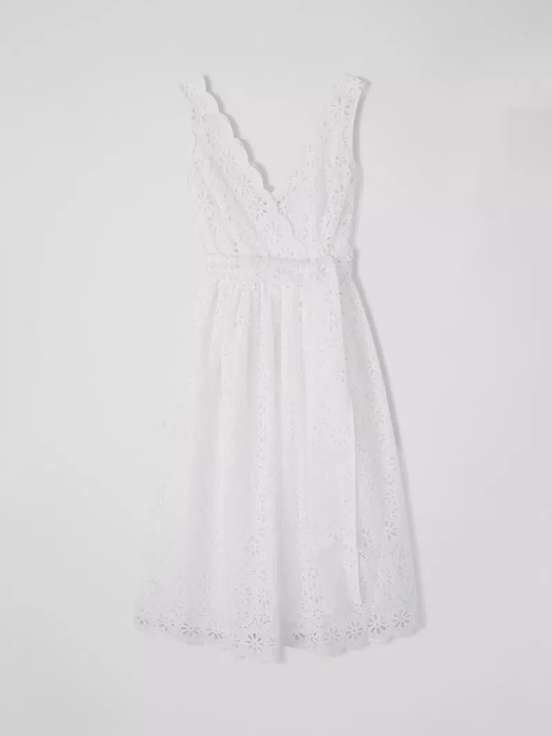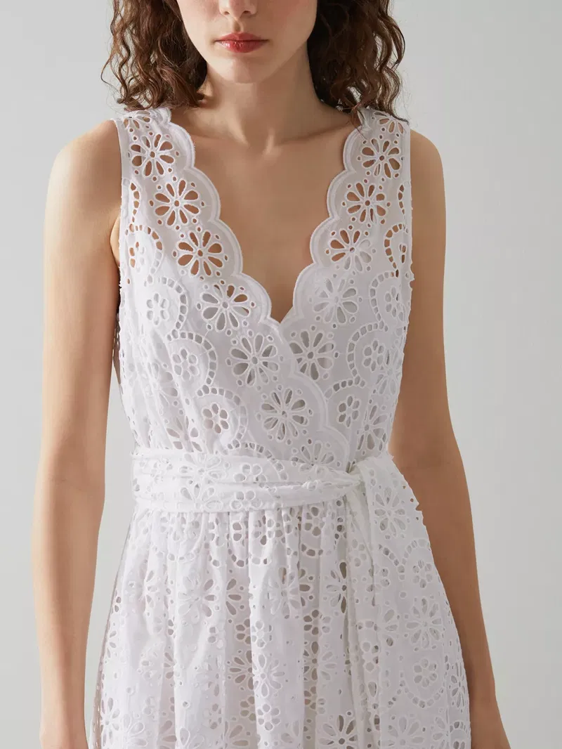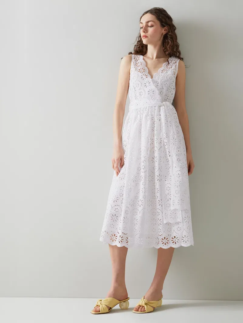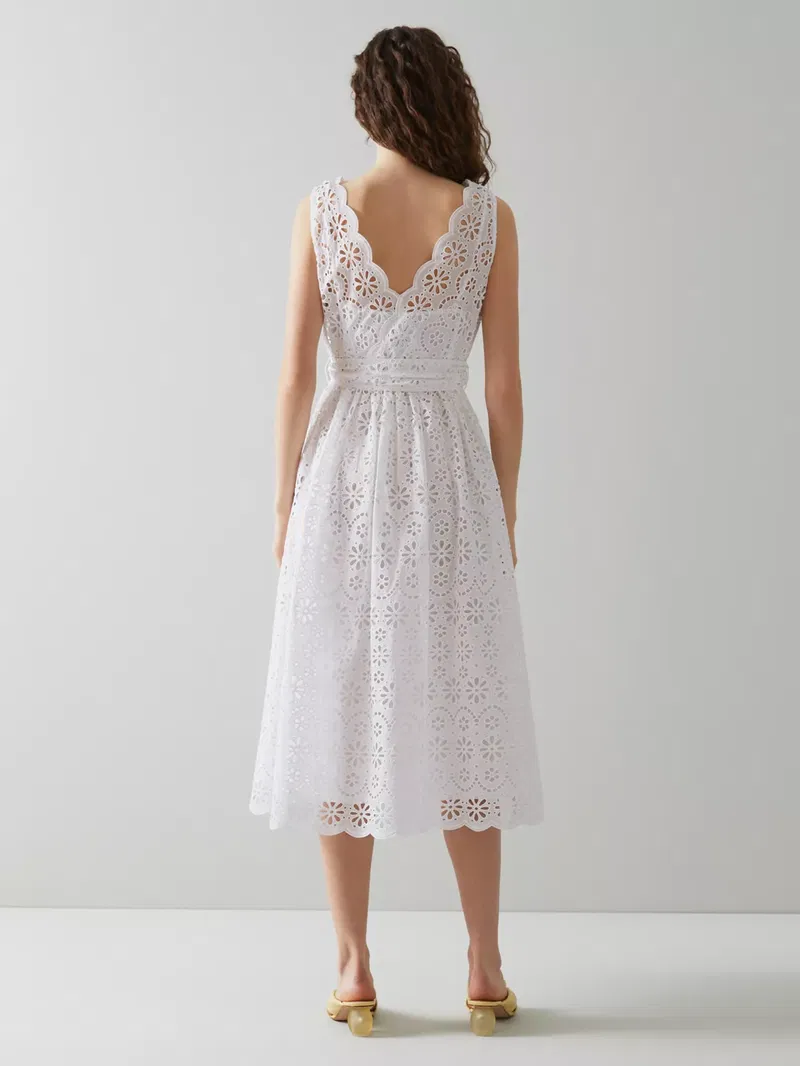 Flaring out at the hem for a feminine silhouette, this self-tie belt midi dress by L.K.Bennett is elevated with intricate broderie anglaise detailing. Framed with a v-neckline and a sleeveless design, this dress offers breathable all-day comfort with its pure cotton fabric and slips on with sandals for a day in the sun.