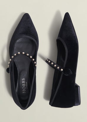 Sleek and chic, the Porth pumps are stylish everyday shoes that also work beautifully as dressy flats for occasions. Crafted from black mesh spot fabric and leather, they have a pointed toe, a leather toe cap, trim and back of the heel, and a very small flat heel. Wear them with tailored looks as an alternative to courts.