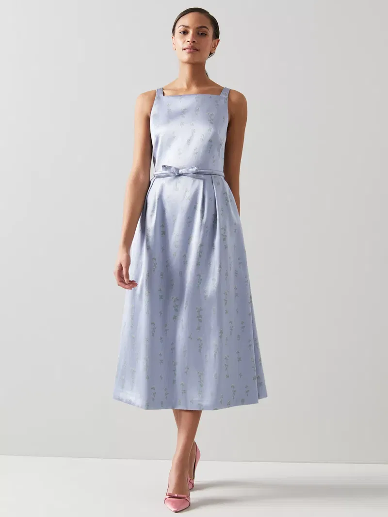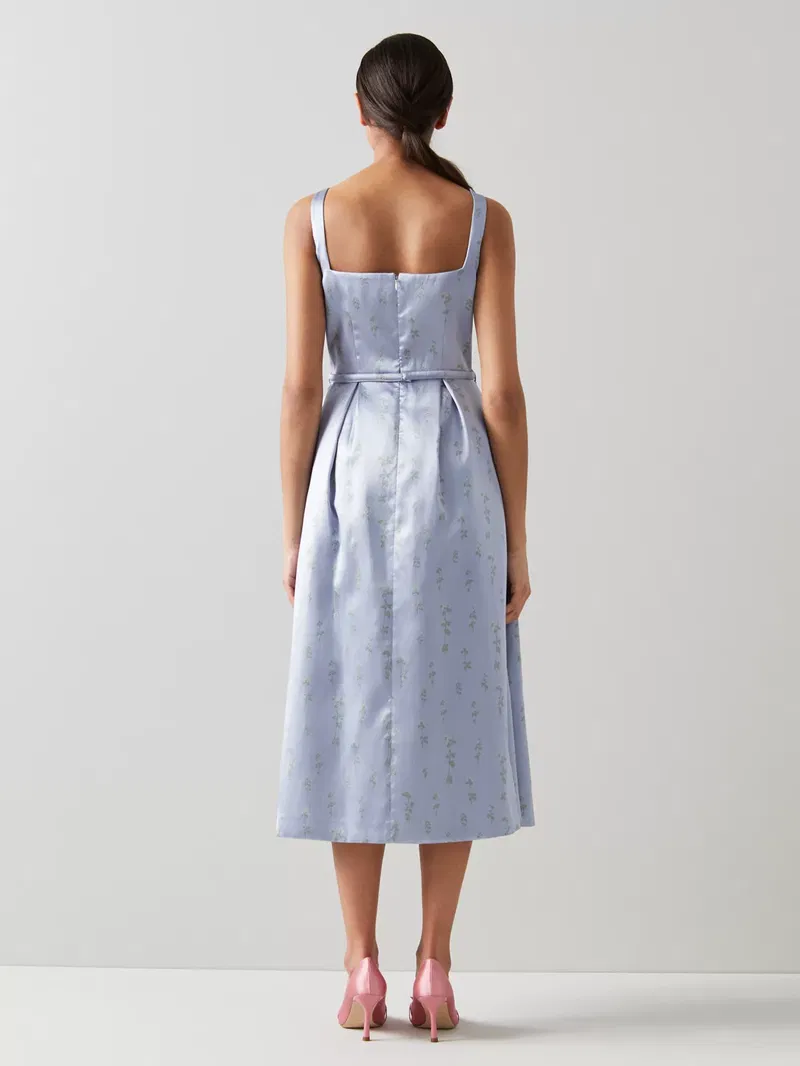 Flaring out at the hem for a feminine silhouette, this midi dress by L.K.Bennett is printed with pretty florals for added charm. With a square neckline and a sleeveless design, it is a elegant a sophisticated choice for this social season.