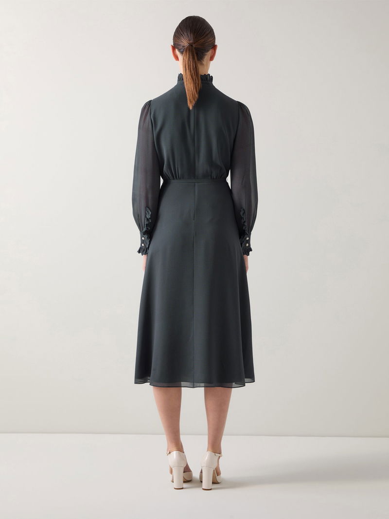The Sadie Midnight Houndstooth Print Georgette Dress combines classic patterning with sustainable design. Made from recycled fabric, this dress features a lightweight georgette texture for comfortable, flowing wear. The houndstooth print in midnight tones adds timeless sophistication, while the included belt defines the waist for a flattering silhouette. Ideal for both day and evening occasions, it offers style with an eco-conscious touch.