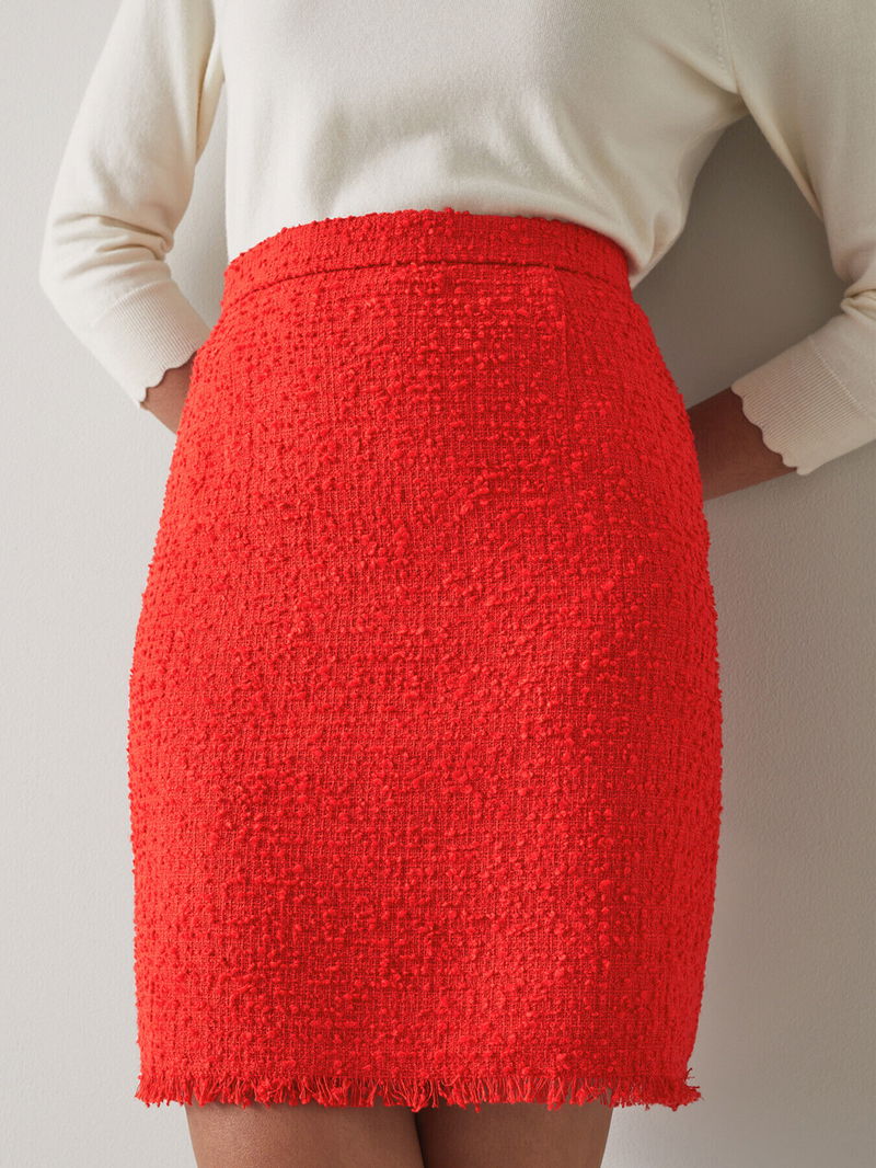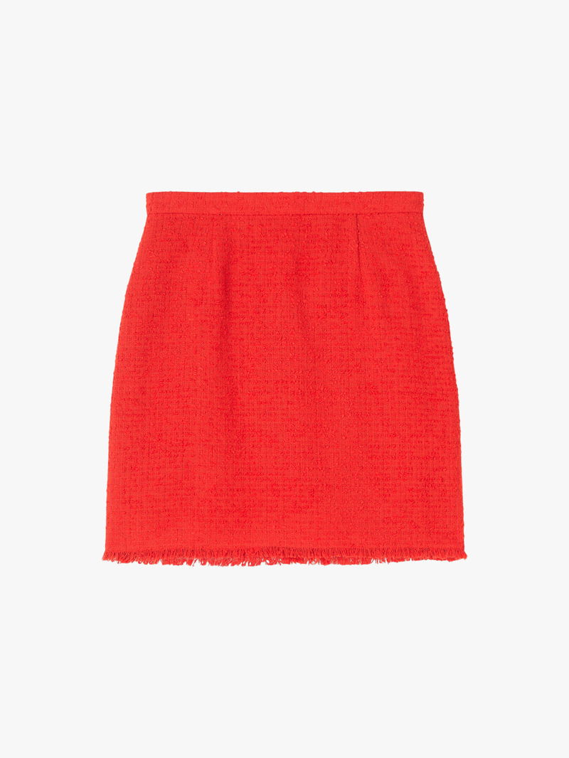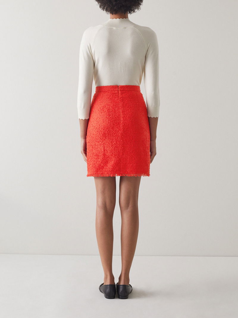 The Saskia skirt is crafted in Europe from Italian tweed in apple red. It sits on the waist, has a straight cut, falls above the knee and is finished with a frayed hem.
