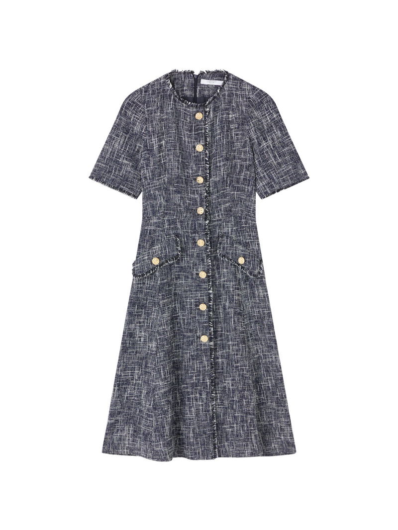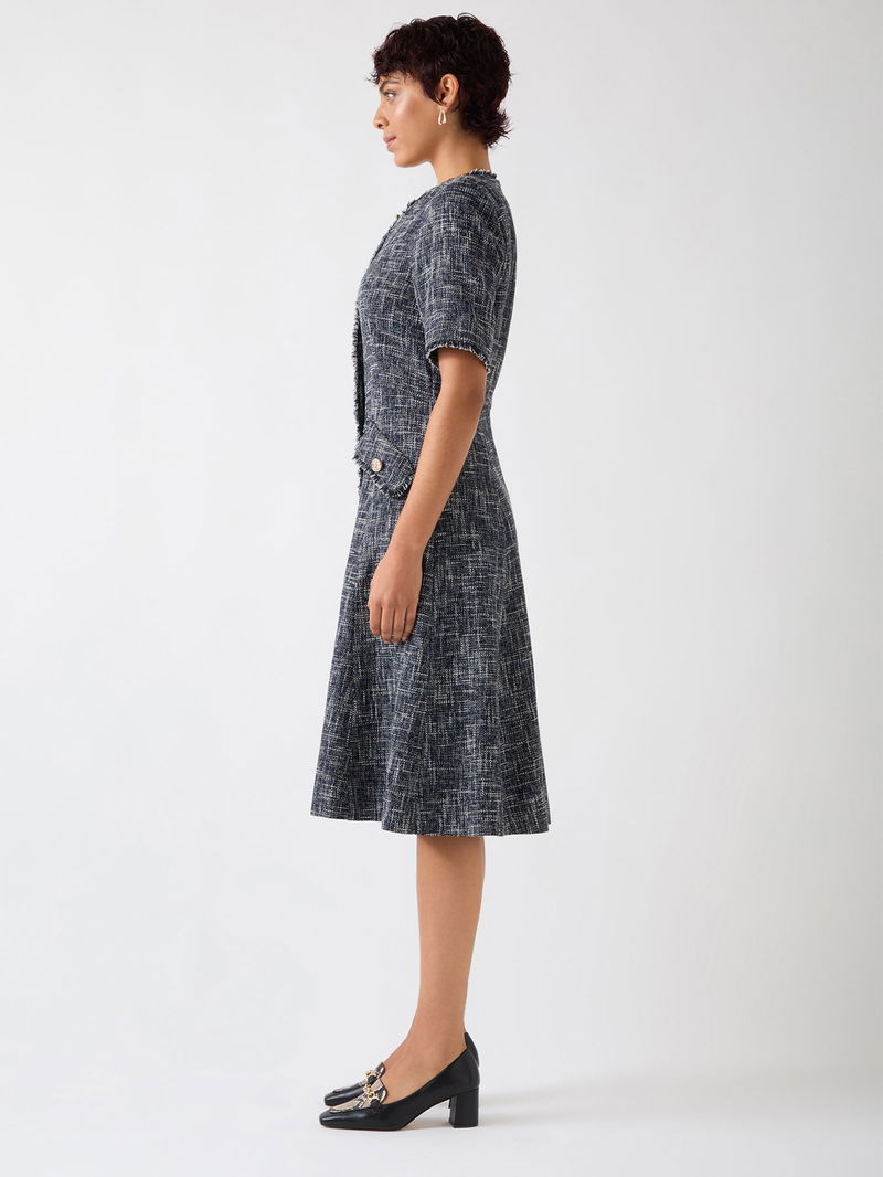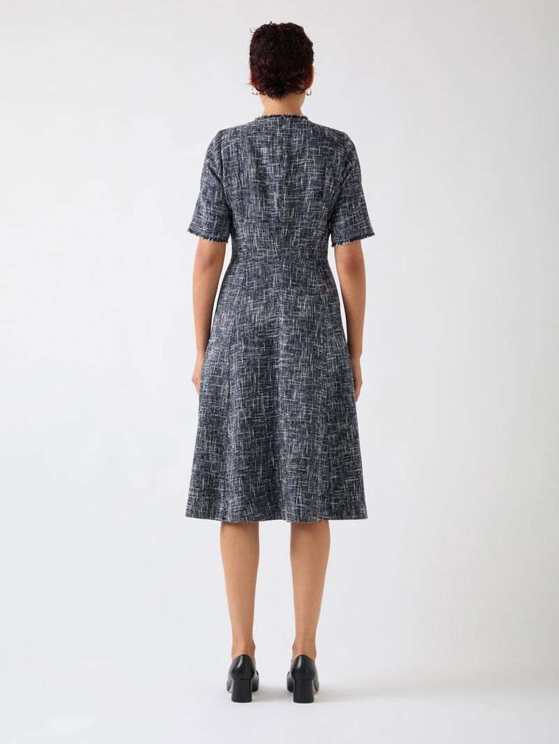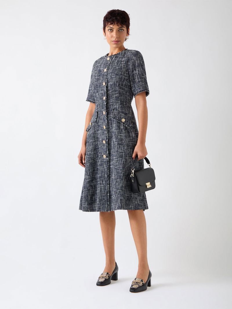 Suzie Indigo & Black & Cream Cotton Blend Tweed Button Through Dress