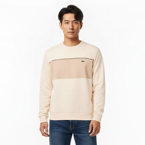 A summery capsule made in light-weight materials, soft colorful combinations and statement graphics. Loose fit, loose ease on body and sleeves, lower shoulders and armholes. Light French terry in organic cotton. Graphic crewneck sweatshirt. Contrasted topstitches. Club Lacoste vintage effect print at chest 3cm tone on tone crocodile with black outline at chest.
