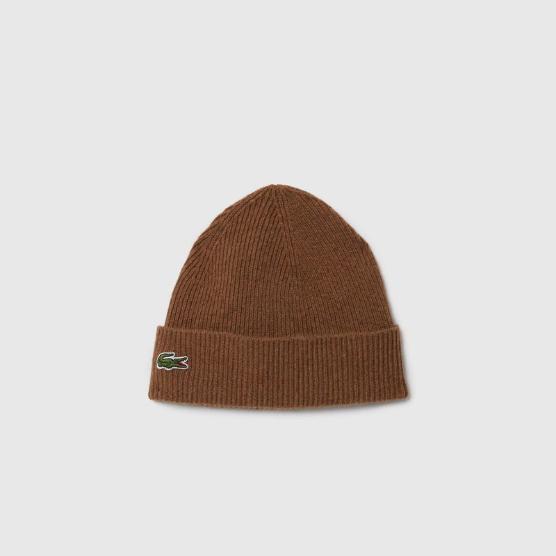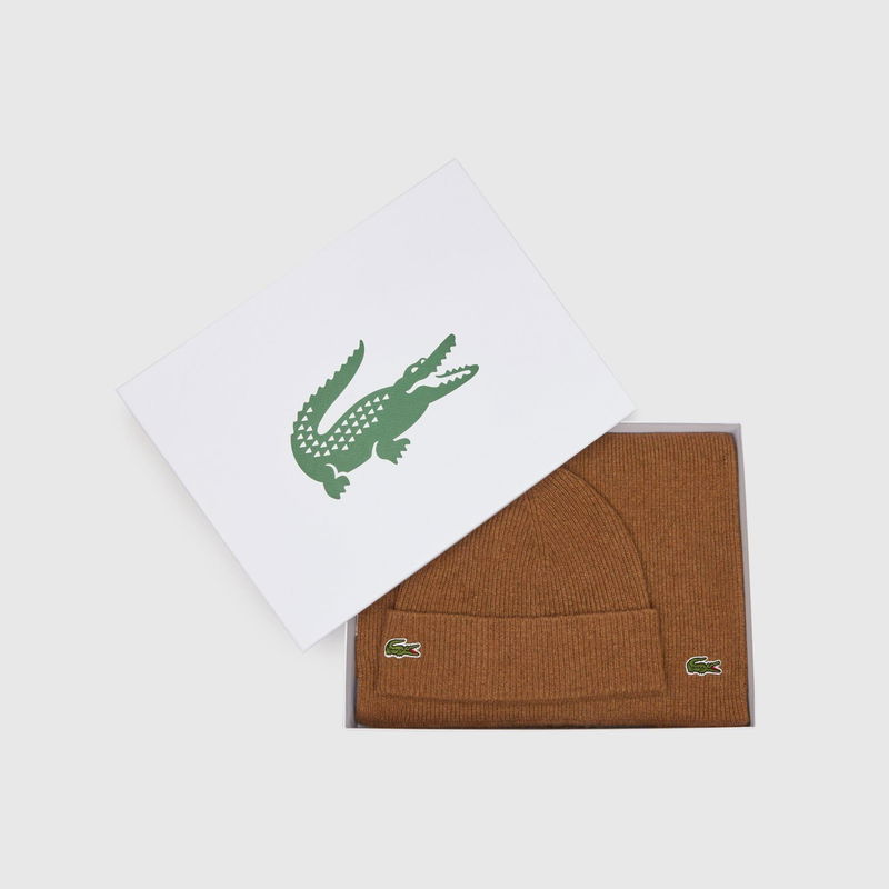 Lacoste Hat and Scarf Set in brown. Ribbed knit scarf and cuffed beanie set. Signature embroidered green crocodile logo. Branded box. Made from a warm soft and durable ribbed wool blend.