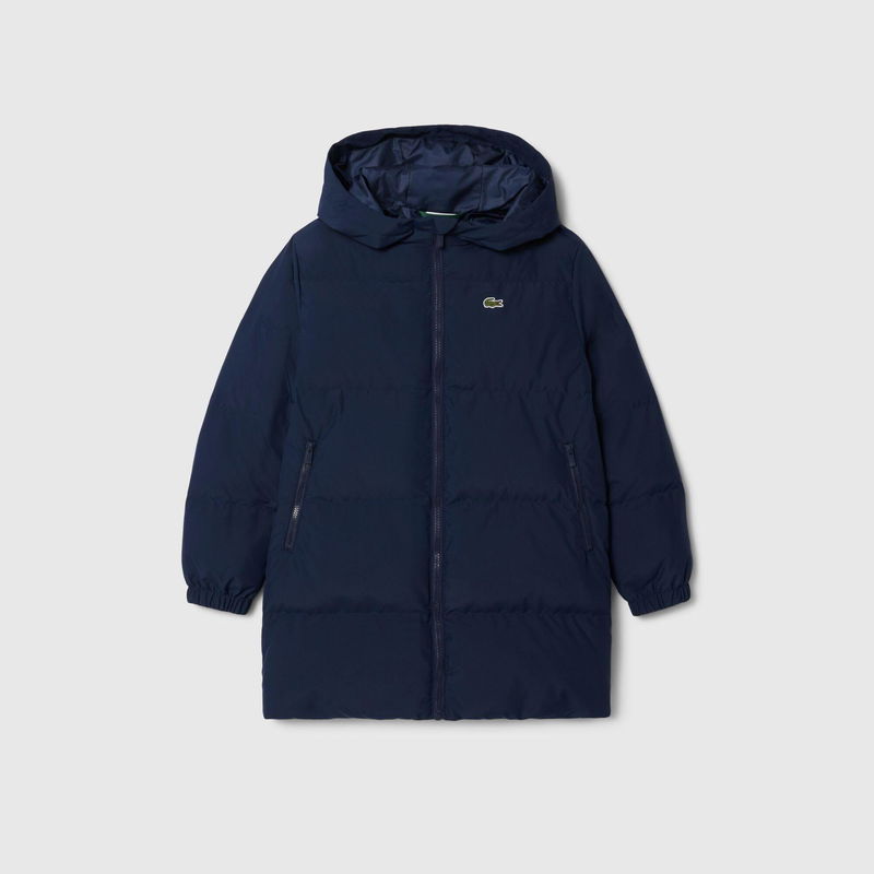 Juniors Lacoste Hooded Puffer Jacket in navy. Fixed hood. Full-length zip. Secure concealed zip pockets on the front. Elasticated cuffs. Signature green crocodile logo badge on the chest.