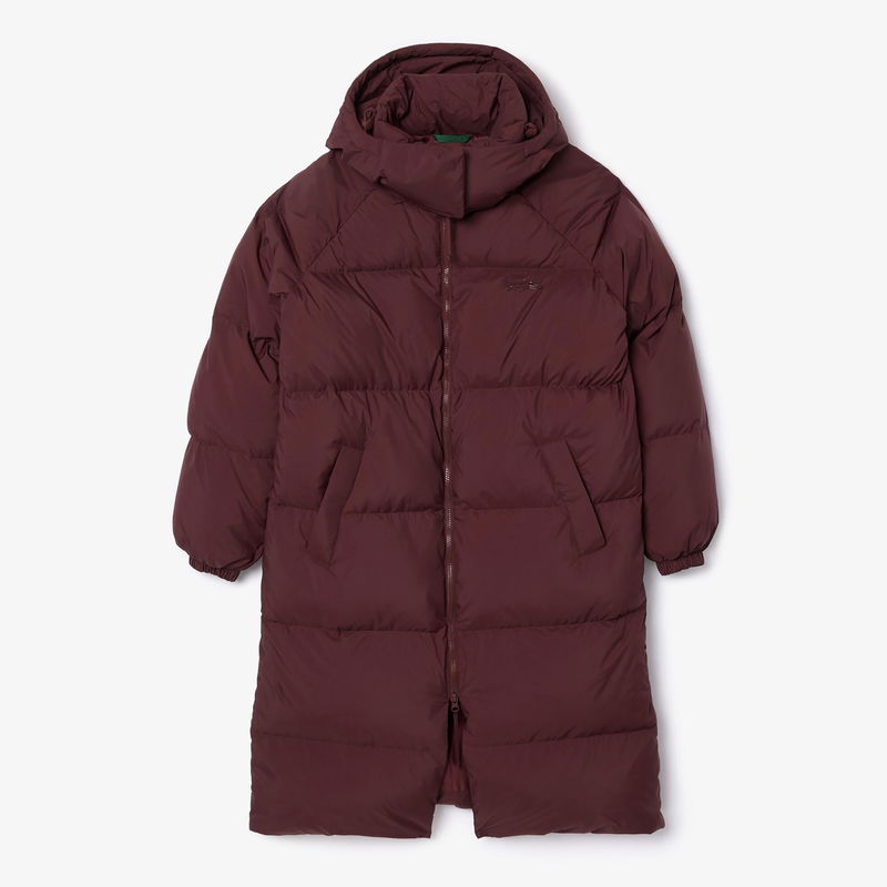 Womens Lacoste Long Oversized Down Logo Jacket in brown. Padded hood. Zip fastening. Side zip pockets. Signature embossed crocodile logo on the chest. Loose fit.
