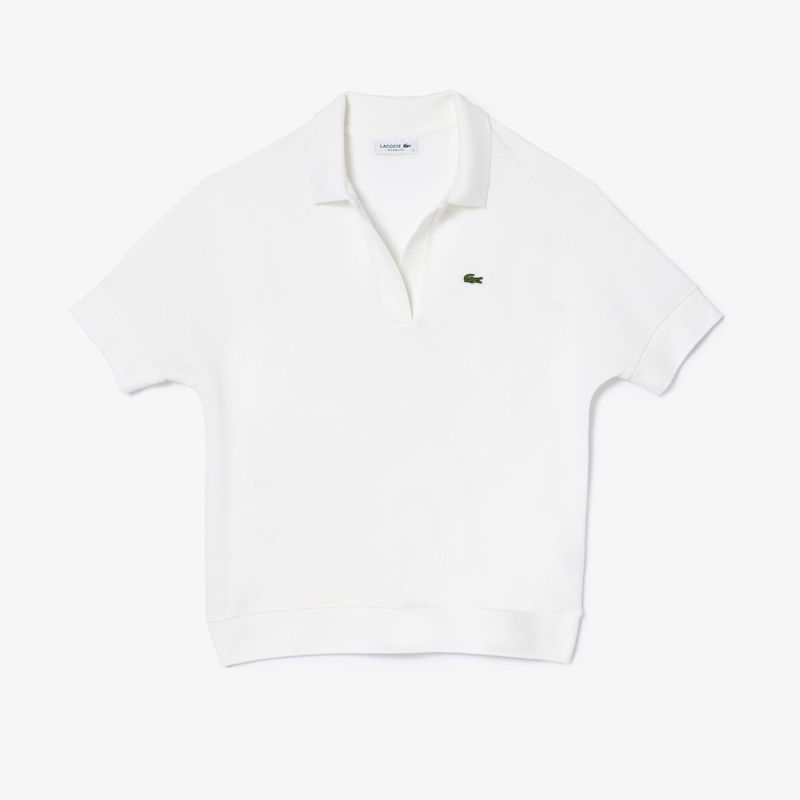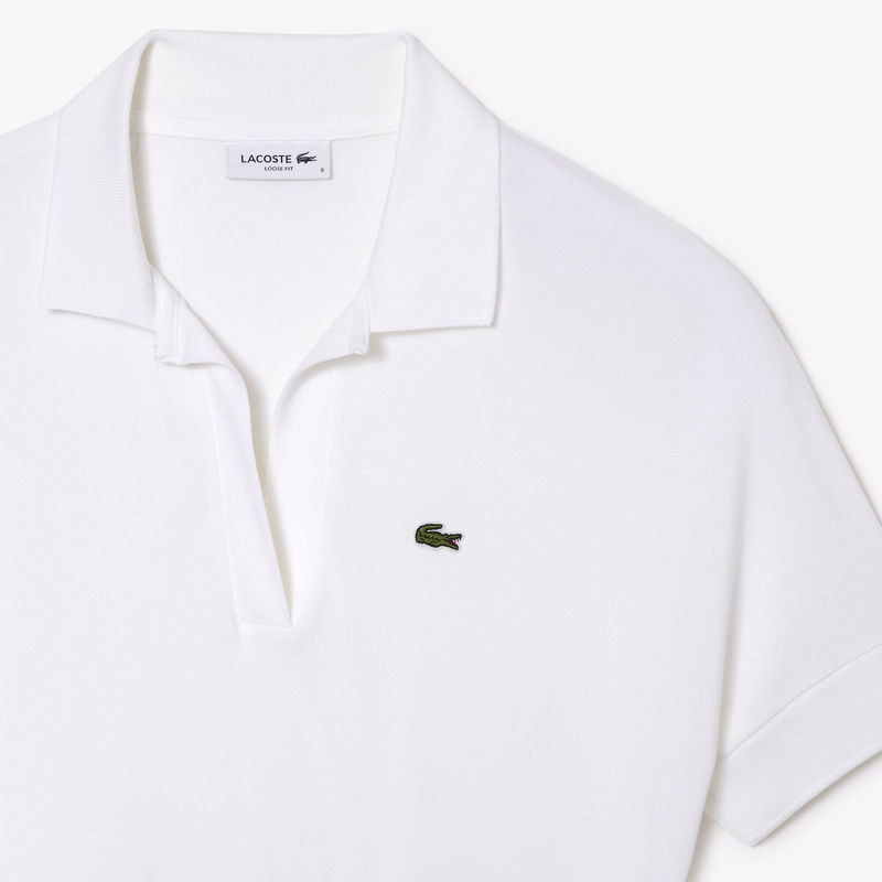 Womens Lacoste Loose-Fit Polo Shirt in white. Ribbed collar (V-neck style). Short sleeves with deep ribbed bands. Embroidered green crocodile on the chest. Relaxed fit.