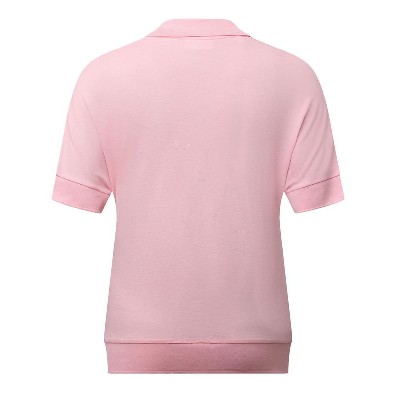Womens Lacoste Loose-Fit Polo Shirt in pink. Open unbuttoned V-neck collar. Short sleeves with ribbed cuffs.