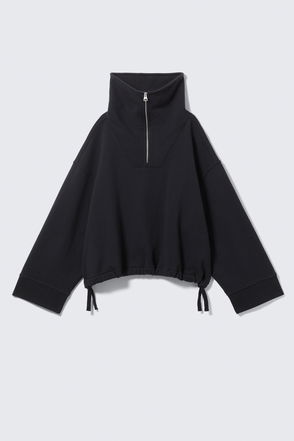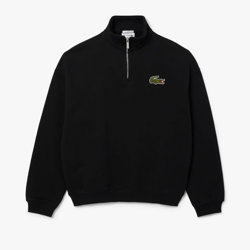 Unisex Lacoste Loose Fit Zip Neck Badge Accent Sweatshirt in black Lacoste expert sportswear creators since 1933 are proud to present this essential design featuring a high zipped neck. Featuring a loose fluid cut minimalist design and comfortable fleece fabric for the ultimate in relaxed chic finished with an XL crocodile. This unisex product runs large if you are a woman choose 1 size smaller than your usual size.