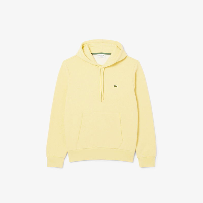 Mens Lacoste Organic Cotton Fleece Hoodie in soleil chine. The essential men,s hoodie from Lacoste sportswear creators since 1933. Made from a soft cotton fleece fabric with a comfortable cut and minimalist design finished with a signature crocodile for a result that,s the height of casual chic. This item runs small. We advise you to take one size larger than your usual size.