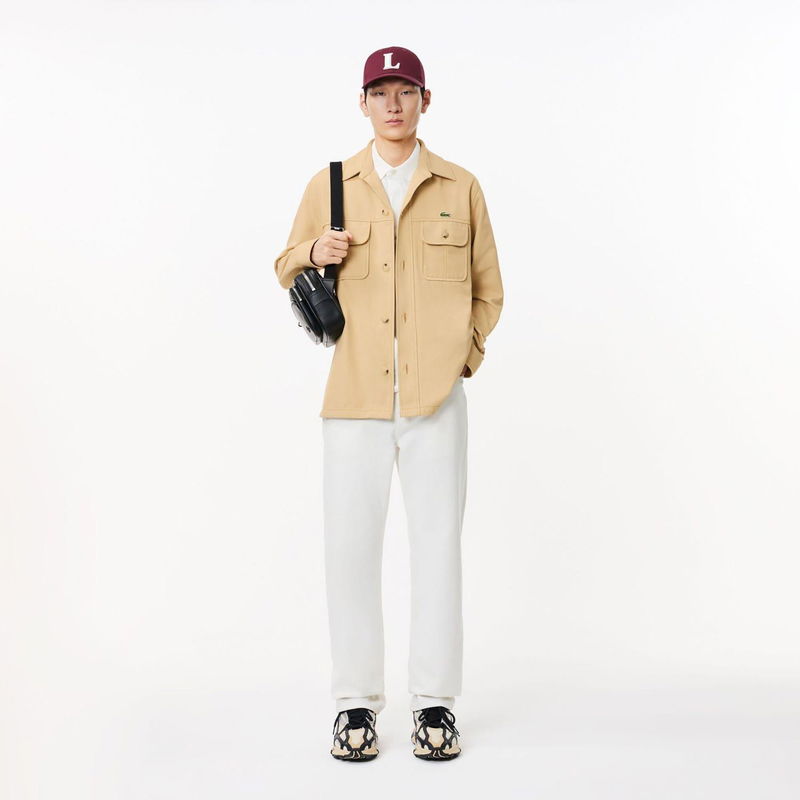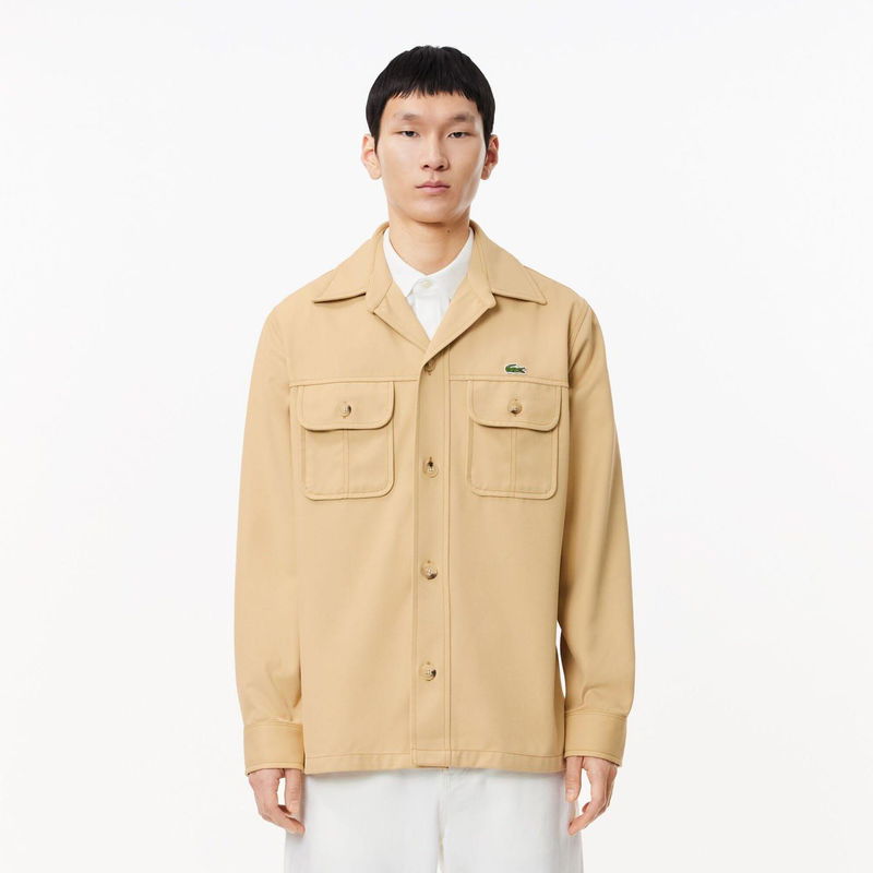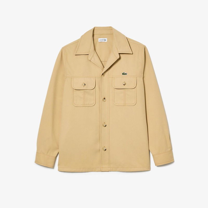 Heavy Cotton Twill Overshirt with Pockets. Classic unbuttoned collar. Buttoned pockets. Embroidered crocodile on chest.