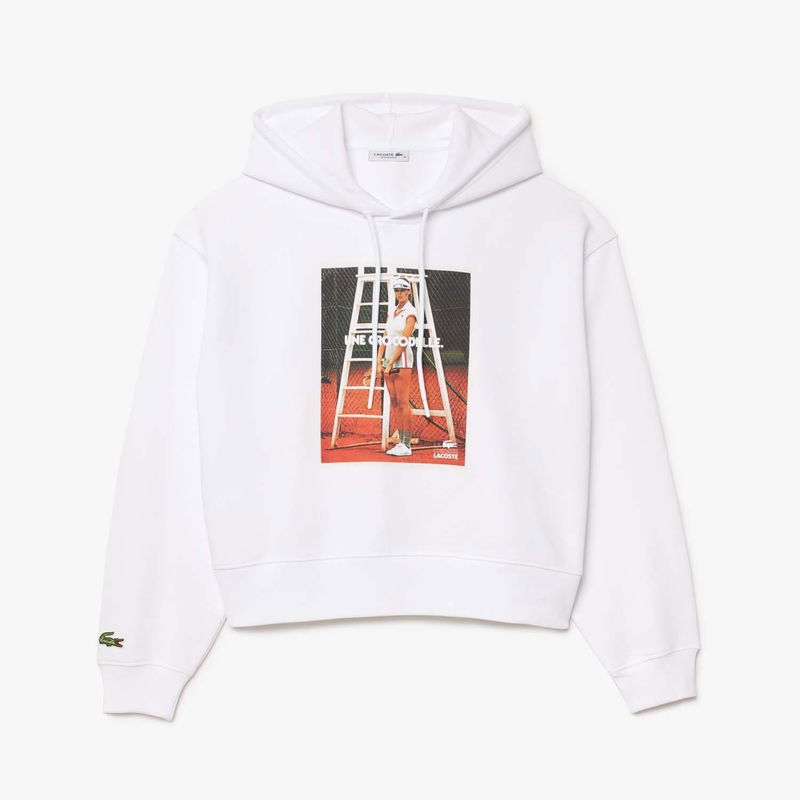 Womens Lacoste Oversized Printed Fleece Hoodie This oversized sweatshirt celebrates Lacoste,s sporting heritage. The tennis print on the breast adds a quirky twist. Blending comfort expert construction and generous proportions for a result that's 100% croco-style.
