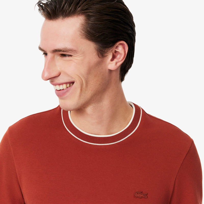 Mens Lacoste Stretch Piqué, Stripe Collar T-Shirt in iberis. Organic cotton piqué. Regular straight cut. Stretch fabric for freedom of movement. Striped ribbed collar. Tonal embroidered crocodile on breast.