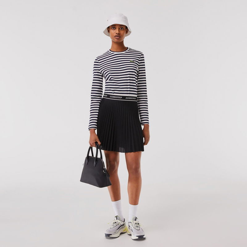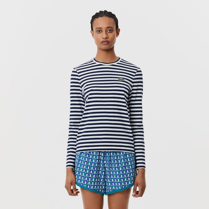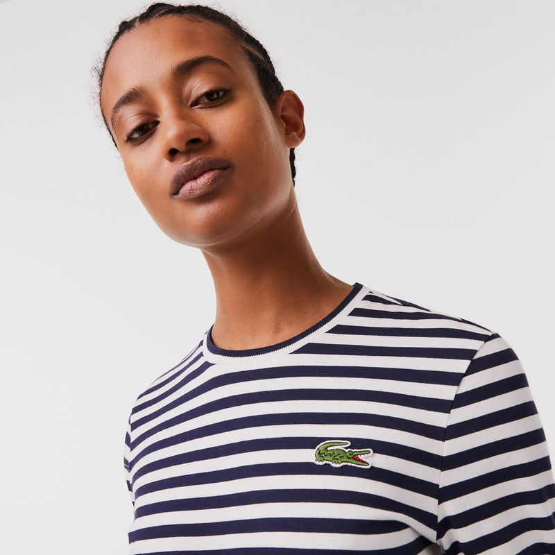 Womens Lacoste Striped Long Sleeve T- Shirt in navy. Ribbed crew neck. Signature embroidered crocodile logo on the chest. Navy blue and white horizontal stripes. Regular fit.