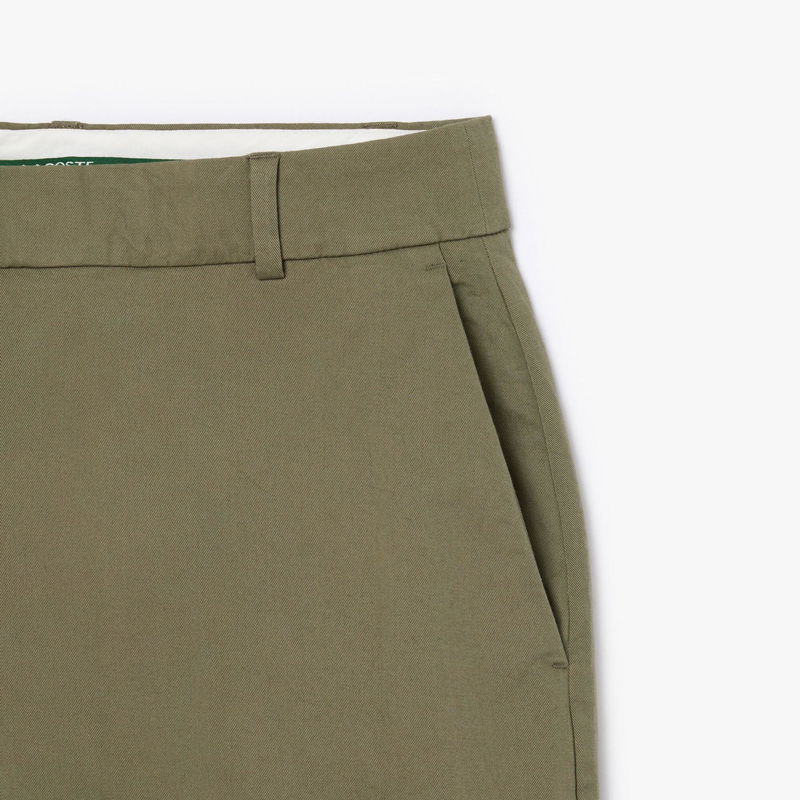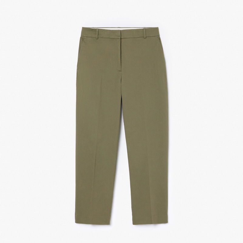 Womens Lacoste Tapered Chinos in khaki. Zip fly with hook and button closure. Side pockets. Belt loops. Embroidered Lacoste crocodile logo above the back right pocket. Tapered leg.