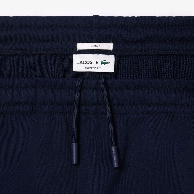 Unisex Lacoste Tapered Leg Sweatpants in navy blue The iconic Lacoste tracksuit: French elegance on the move. This practical piece features a modern tapered cut and an iconic intricate embroidered crocodile on the back. The ultra-soft fleece fabric is inspired by sports kits for a contemporary everyday style. This unisex product runs large if you are a woman choose 1 size smaller than your usual size.