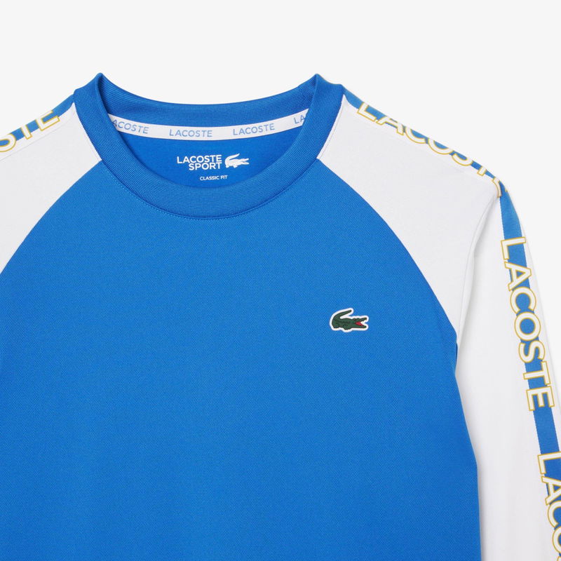 Mens Lacoste Sport Colour-Block Stripe Sweatshirt in gipsy blue - white. Technical abrasion-resistant recycled polyester limiting the use of raw materials. Classic fit for natural ease. Cut and sewn colour-block panels. Contrast Lacoste branded stripes down sleeves. Silicone crocodile on chest.