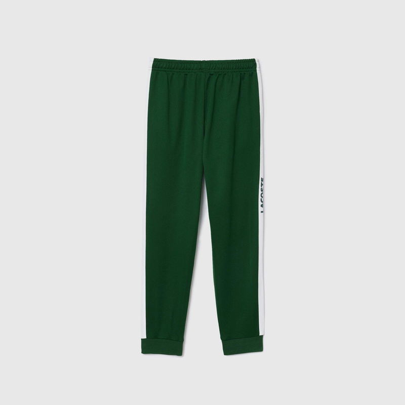 Juniors Lacoste Tennis Tracksuit in green white. High neck. Full zip fastening. Zippered pockets. Ribbed cuffs and hem. Color-block design. Embroidered crocodile logo on the chest. Water-repellent coating. Recycled polyester interlock or diamond taffeta mesh lining.
