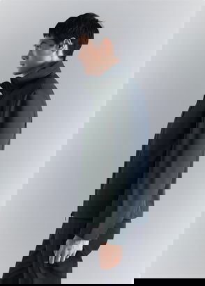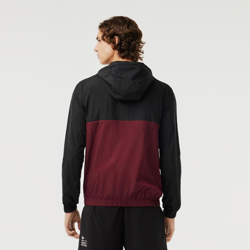 Mens Lacoste Water Resistant Pack away Sport Jacket in black. High neck and a hood with an adjustable drawstring. Full zip fastening. Zipped pockets. Elasticated cuffs and hem. Lacoste crocodile logo on the chest. Colorblock design. Water-repellent recycled polyester or polyamide diamond taffeta with a breathable mesh lining.
