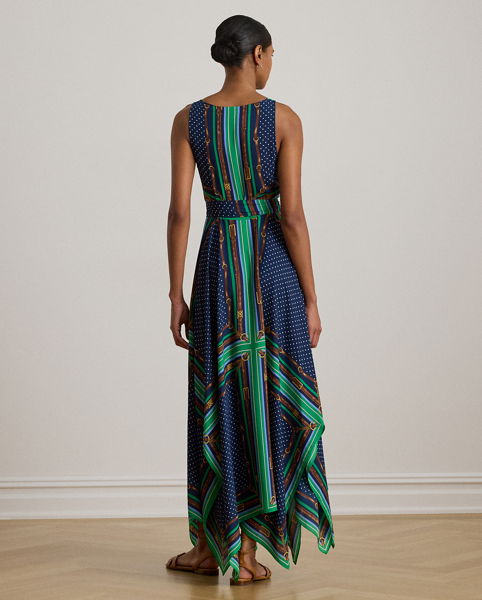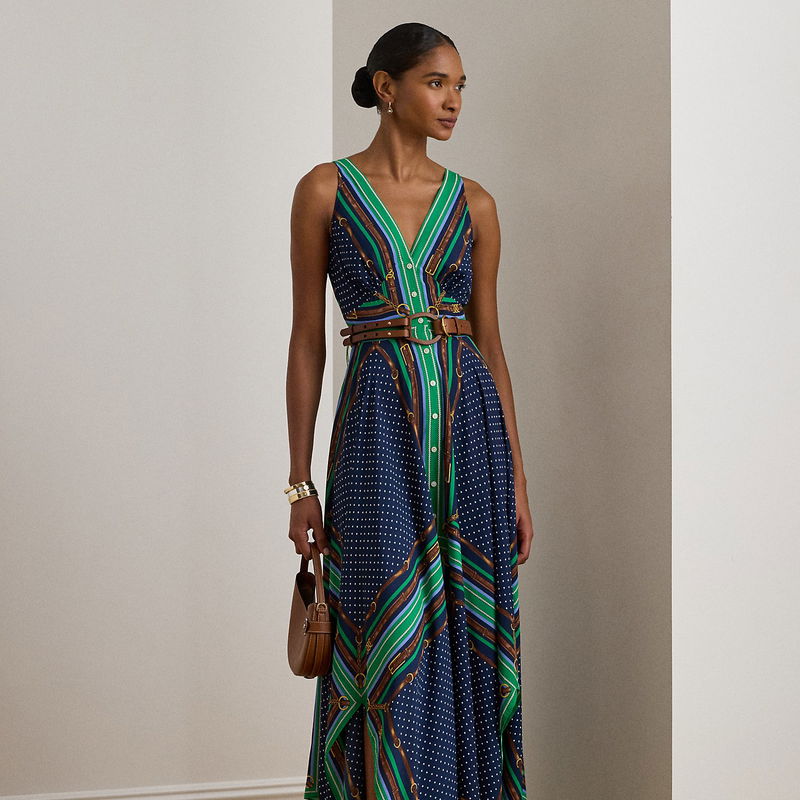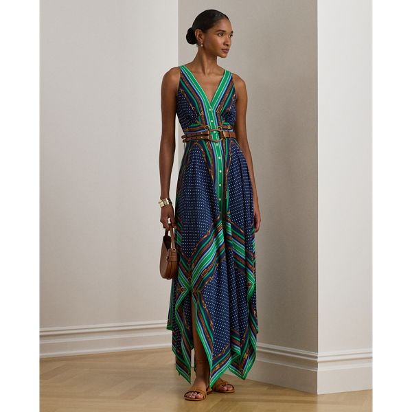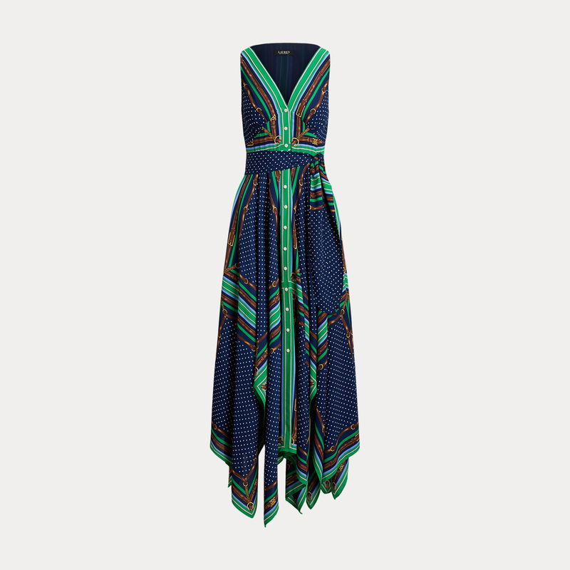 Uniting classic polka dots with Ralph Lauren Lauren’s equestrian-inspired print, this belted sleeveless dress features lightweight georgette and a handkerchief hem skirt for effortless movement.