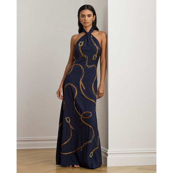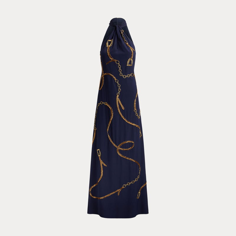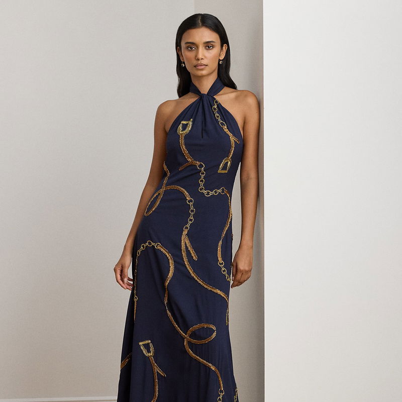 Crafted from crepe de Chine, this stunning gown with a twist-front halter neckline displays a beaded, equestrian-inspired belting motif.