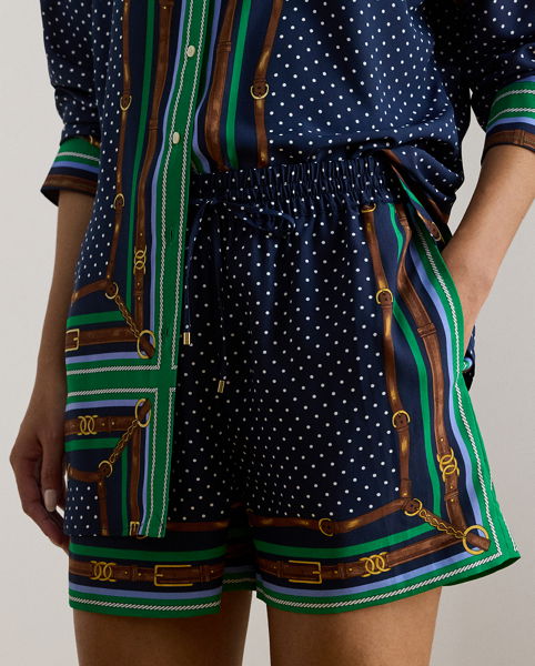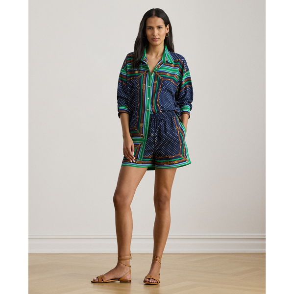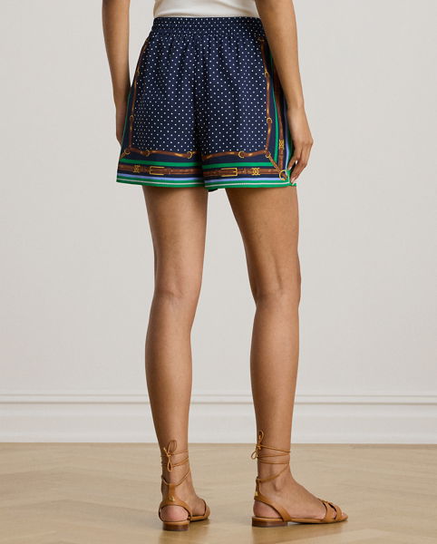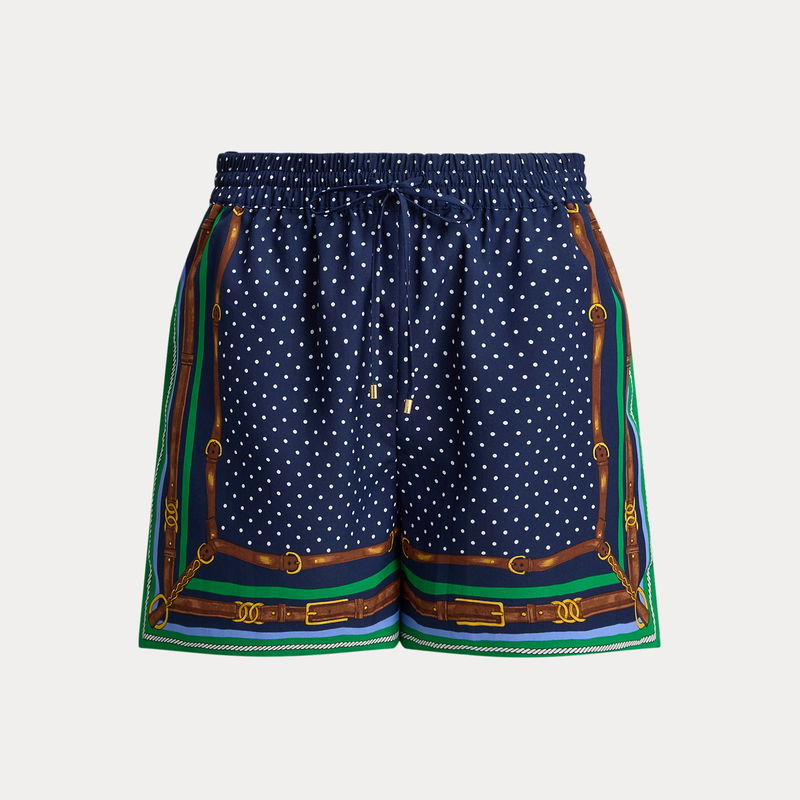 Made from lightweight crepe de chine, these drawcord shorts blend classic polka dots with Ralph Lauren Lauren’s equestrian-inspired belting print. "LRL"-engraved cord ends add a subtle signature finish.