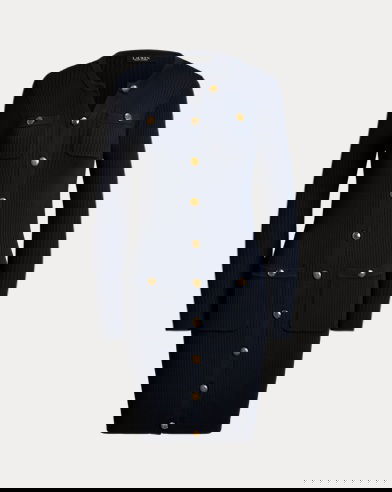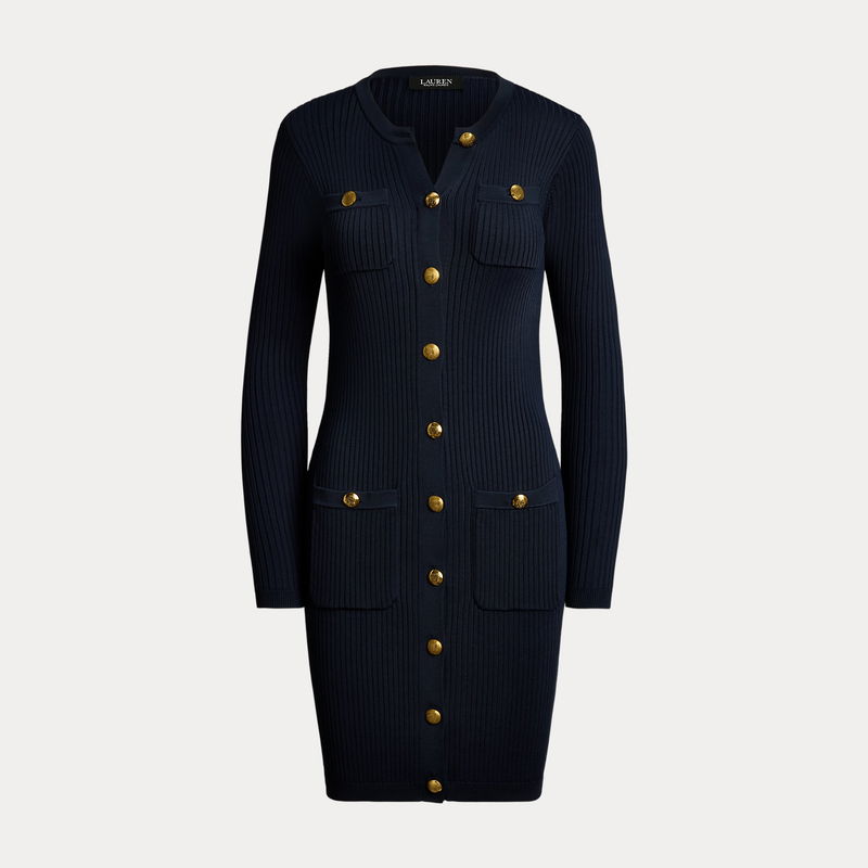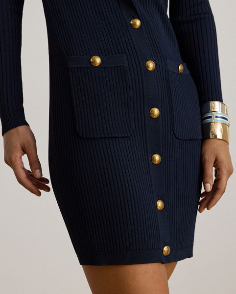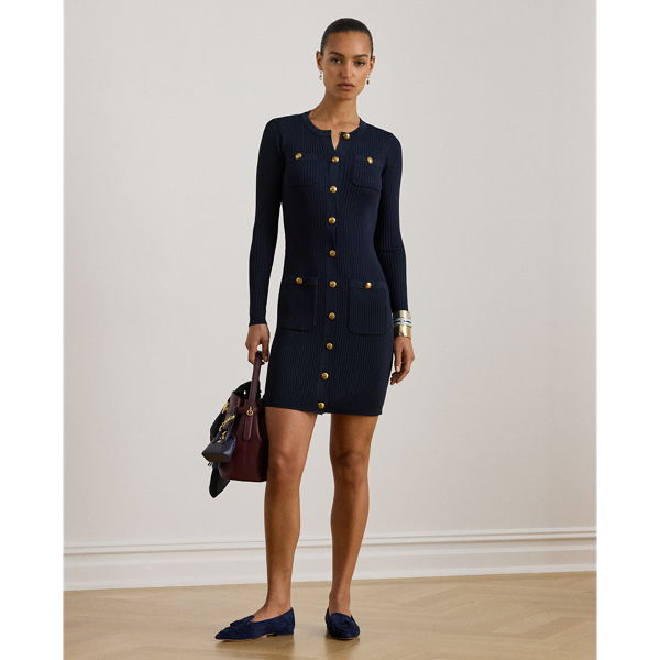 A rib-knit construction brings rich dimension to this slim-fitting jumper dress, which is finished with crest-embossed buttons for signature style.