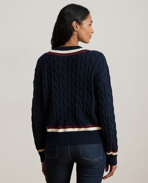 Detailed with contrast stripes along the neckline, cuffs and hem, this version of the classic cricket jumper is cable-knit with combed cotton for an ultrasoft hand feel. An "LRL"-embroidered logo above the hem adds a signature finish.