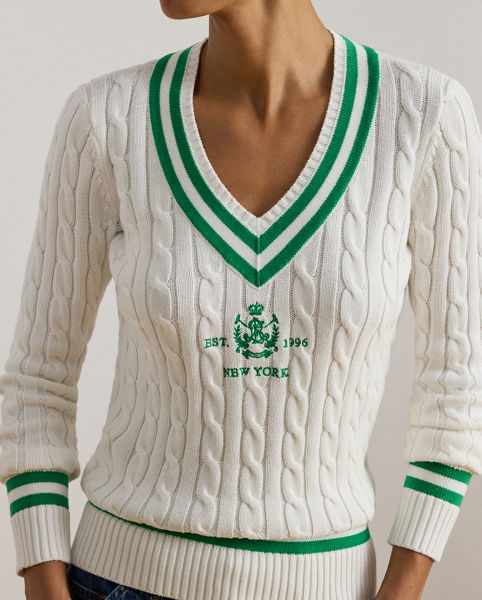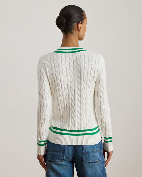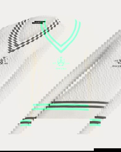 Detailed with stripes along the neckline, cuffs, and hem, this version of Lauren’s signature cricket jumper features a cable-knit combed cotton construction and an embroidered logo crest at the chest.
