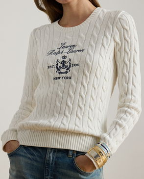 Spun from combed cotton for an ultra-soft look and feel, this full-zip jumper is distinguished by an elegant mockneck and a timeless cable knit. An embroidered “LRL” monogram adorns the left chest, adding a signature touch.