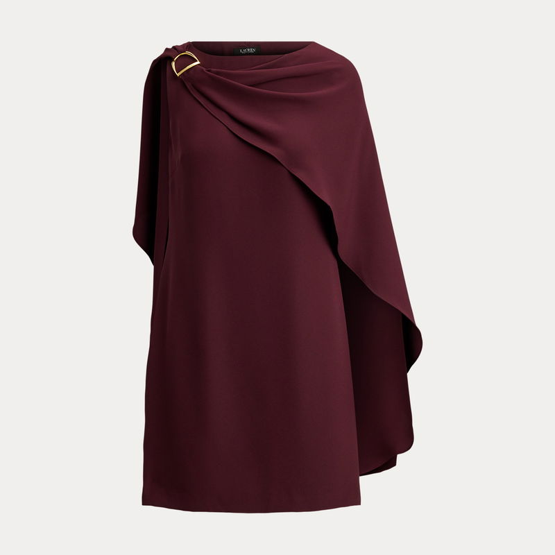An asymmetrical cape overlay brings fluid movement to this double-faced georgette cocktail dress, while a stirrup-shaped buckle at the shoulder captures Ralph Lauren Lauren’s equestrian-inspired spirit.