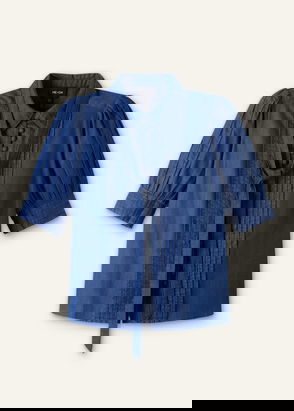 Crafted with lightweight cotton chambray, this effortless cropped blouse features voluminous bubble sleeves and an elasticised drawcord waist for a blouson effect.
