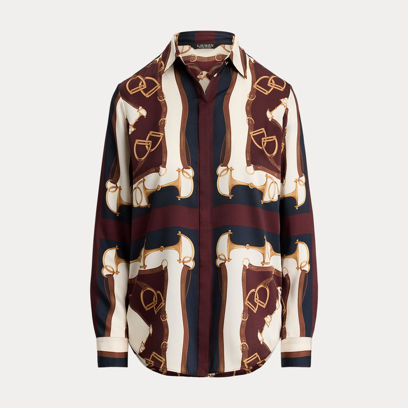 Crafted with smooth twill for a subtle sheen, this collared shirt highlights the season’s equestrian-inspired print. Signature engraved buttons complete the look.